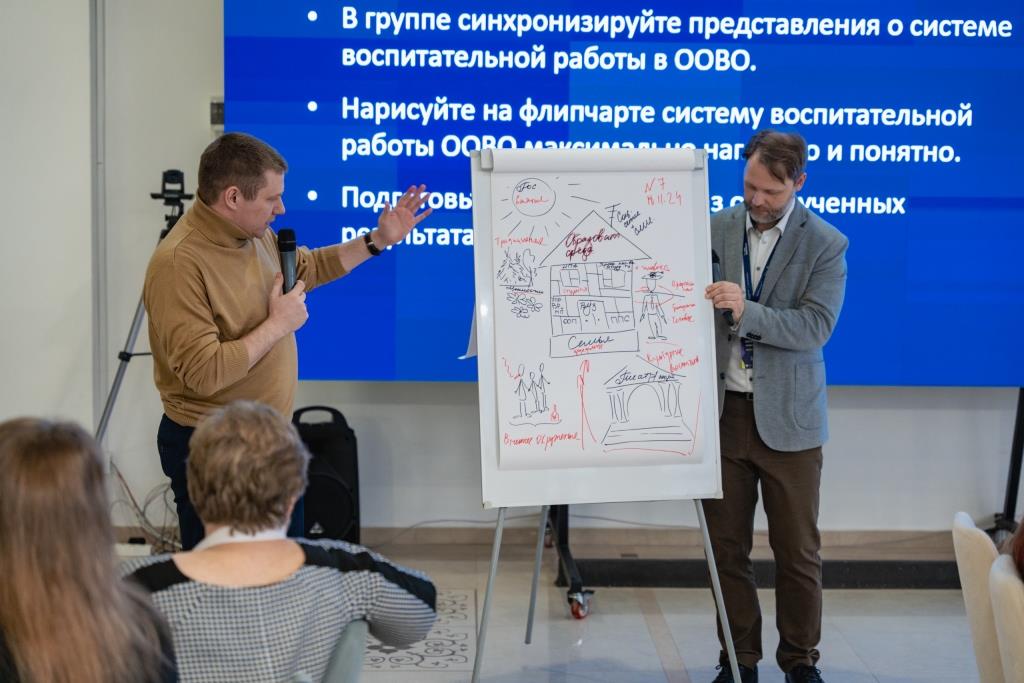 В рамках первого дня участники прошли входную анкету, поработали в группах с целью обсуждения текущих воспитательных моделей в ООВО, приняли участие в тренинге по повышению уровня мотивации, проведенного экспертом РАНХиГС, бизнес-тренером Ю.В. Максимкиной, а также прослушали лекцию историка искусств, соучредителя Томского православного просветительского фонда «Фавор» А.И. Архангельского, посвященную творчеству в воспитании молодежи.