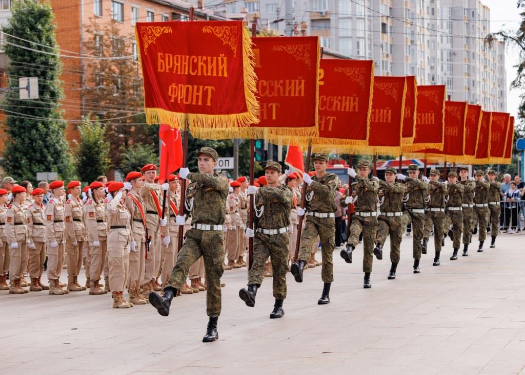 В торжественном марше по площади прошли курсанты военного учебного центра, кадеты, юнармейцы, сводный военный духовой оркестр Брянской области.