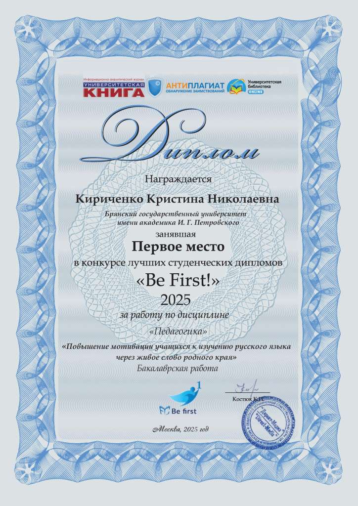 По итогам X Всероссийского конкурса выпускных квалификационных работ «Be First!» выпускница 2025 г. филиала БГУ в г. Новозыбкове направления подготовки Педагогическое образование профиль Русский язык, Литература, а ныне магистр филологического факультета БГУ Кириченко Кристина заняла I место по дисциплине «Педагогика», представив на конкурс бакалаврскую работу «Повышение мотивации учащихся к обучению русского языка через живое слово родного края». ВКР студентка выполнила под научным руководством профессора кафедры социально-экономических дисциплин, доктора филологических наук Стародубец Светланы Николаевны.