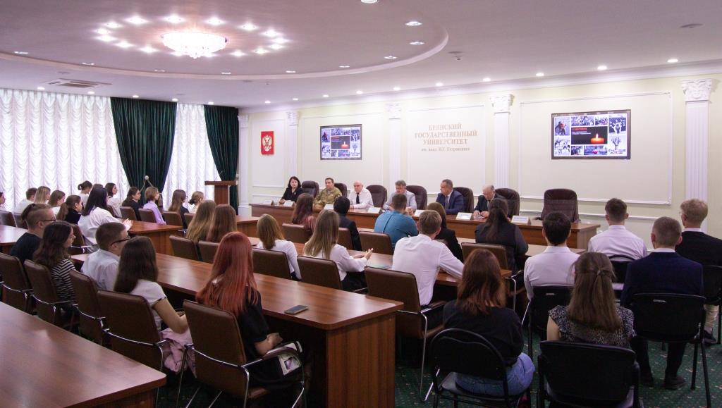 4 сентября в конференц-зале университета состоялась встреча студентов и преподавателей с представителями землячеств и национальных диаспор Брянщины, руководителями ветеранских организаций. В мероприятии приняли участие проректор по социальной работе и молодежной политике А.И. Артюхов, начальник управления по безопасности, мобилизационной работе и общим вопросам П.В. Тарико, начальник отдела социально-культурной политики и воспитательной работы С.П. Зятикова, представитель Правительства Республики Дагестан в Брянской области А.Ш. Султанов, председатель региональной общественной организации «Ветераны-пограничники Брянской области» подполковник запаса А.В. Колибердин, подполковник запаса, кавалер ордена Боевого Красного Знамени, двух орденов Красной Звезды В.В. Абрамов.