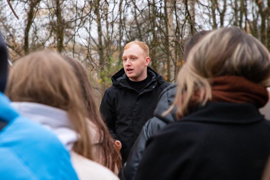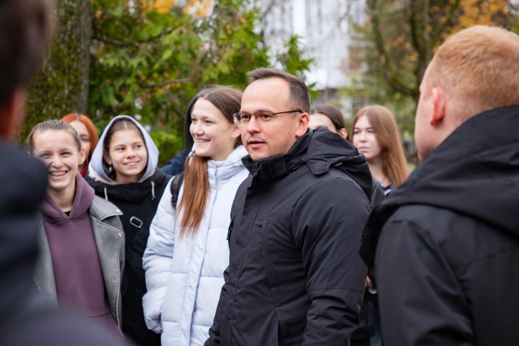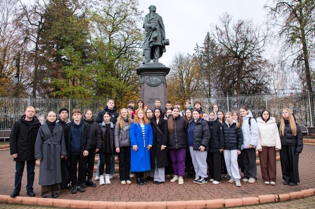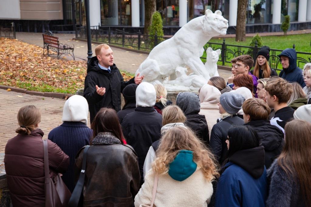 Финальным маршрутом для пешеходной экскурсии вновь стал путь от Площади Ленина к Набережной. Минуя площадь Ленина, студенты подошли к памятнику нашего земляка — поэта Ф.И. Тютчева, через парк свернули в главный городской сквер, в народе называемый «Круглый», где познакомились с историей таких памятников архитектуры XIX века, как Винный замок, бывшая женская гимназия, здание нынешней администрации Советского района г. Брянска. Спускаясь по лестнице на Набережную, студенты зашли в Сад Победы, заложенный в память о павших в годы Великой Отечественной войны. Возле здания Брянской областной филармонии Алексей Мачулин познакомил первокурсников с историей Новопокровского собора, на месте которого теперь располагается сквер, рассказал о памятнике братьям-просветителям Кириллу и Мефодию.