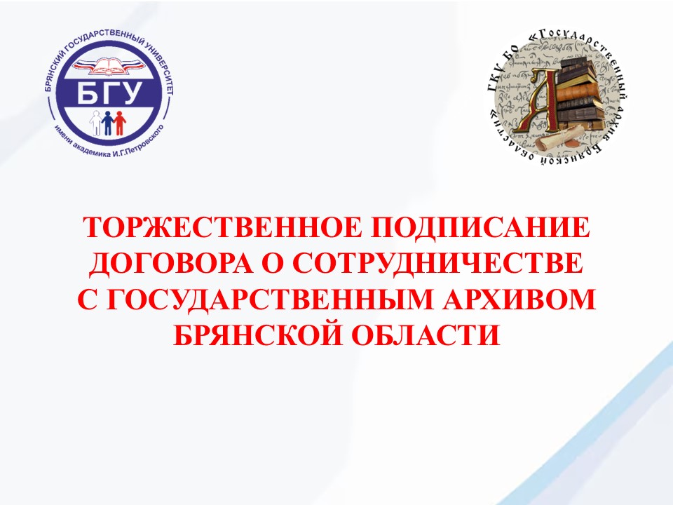 25 февраля 2026 года состоялось подписание договора о сотрудничестве между Брянским государственным университетом и Государственным архивом Брянской области, который соответственно подписали их руководители А.В. Антюхов и Н.Н. Антошина.