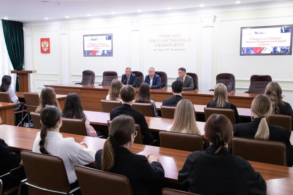 Со словами приветствия к студентам обратился ректор университета А.В. Антюхов, который отметил, что одним из приоритетных направлений организации молодежной политики и воспитательной работы в Брянском госуниверситете является активное формирование у обучающихся чувства патриотизма, любви к собственному Отечеству и родному краю, бережное сохранение памяти об истории Великой Отечественной войны. В год 80-летия Победы в вузе проведено более 124 мероприятий, приуроченных этой дате. Студенты университета занимаются поисковой работой, работают в архивах музеев, ежегодно принимают участие в «Вахте памяти», навещают ветеранов войны, участвуют в федеральных патриотических акциях.