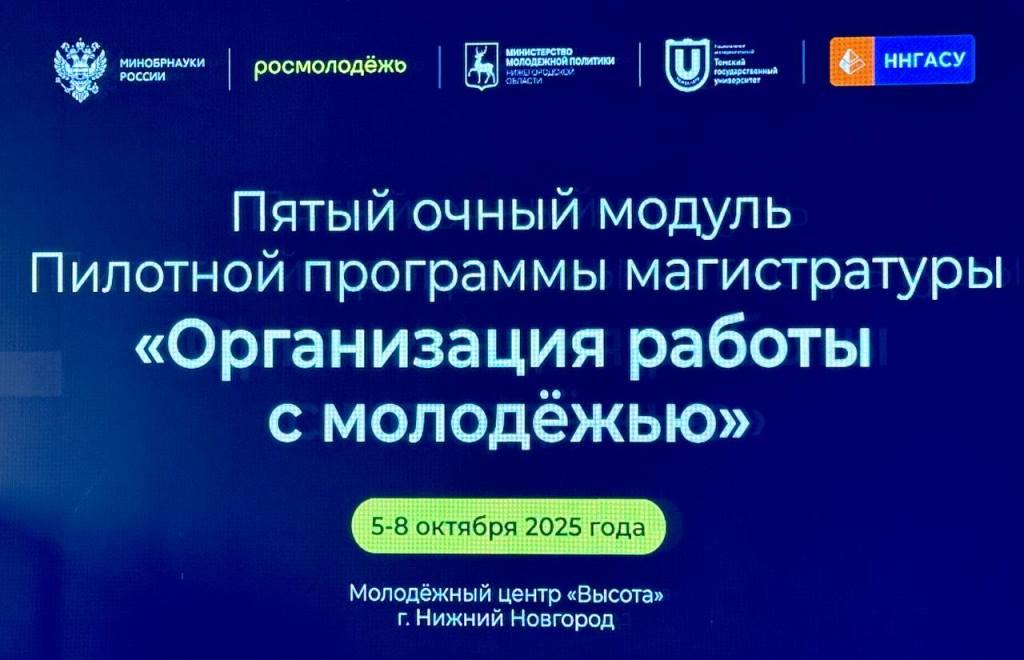 С 5 по 8 октября в г. Нижний Новгород состоялся 5 очный модуль Пилотной программы магистратуры «Организация работы с молодежью», в котором приняла участие проректор по социальным вопросам, молодежной политике и воспитательной работе И.И. Киютина. Программа реализуется Министерством науки и высшего образования Российской Федерации совместно с Федеральным агентством по делам молодежи и Томским государственным университетом.