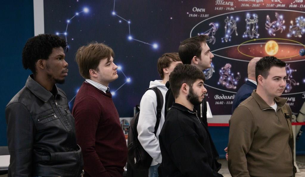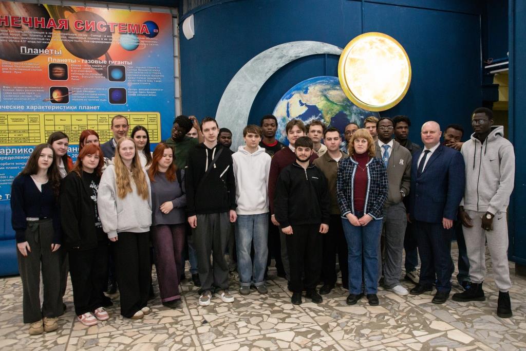 В рамках мероприятий Недели космоса в БГУ делегация иностранных обучающихся и студентов физико-математического факультета нашего университета в сопровождении декана физико-математического факультета А.В. Савина, и.о. заведующего кафедрой экспериментальной и теоретической физики, доцента Н.В. Митрошенкова посетили Брянский планетарий. Целью данного мероприятия стало знакомство студентов с историей мировой космонавтики, чудесами ночного неба и тайнами Солнечной системы.