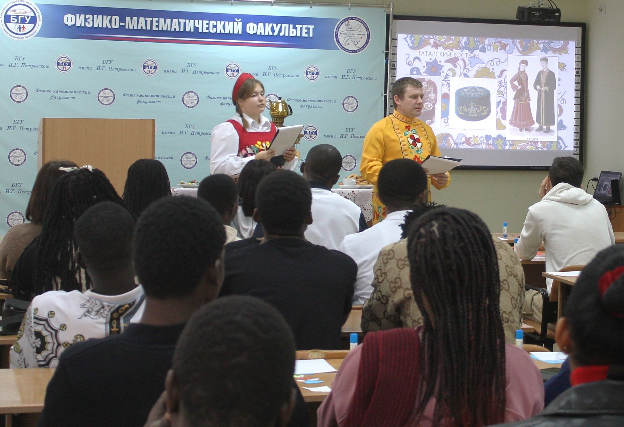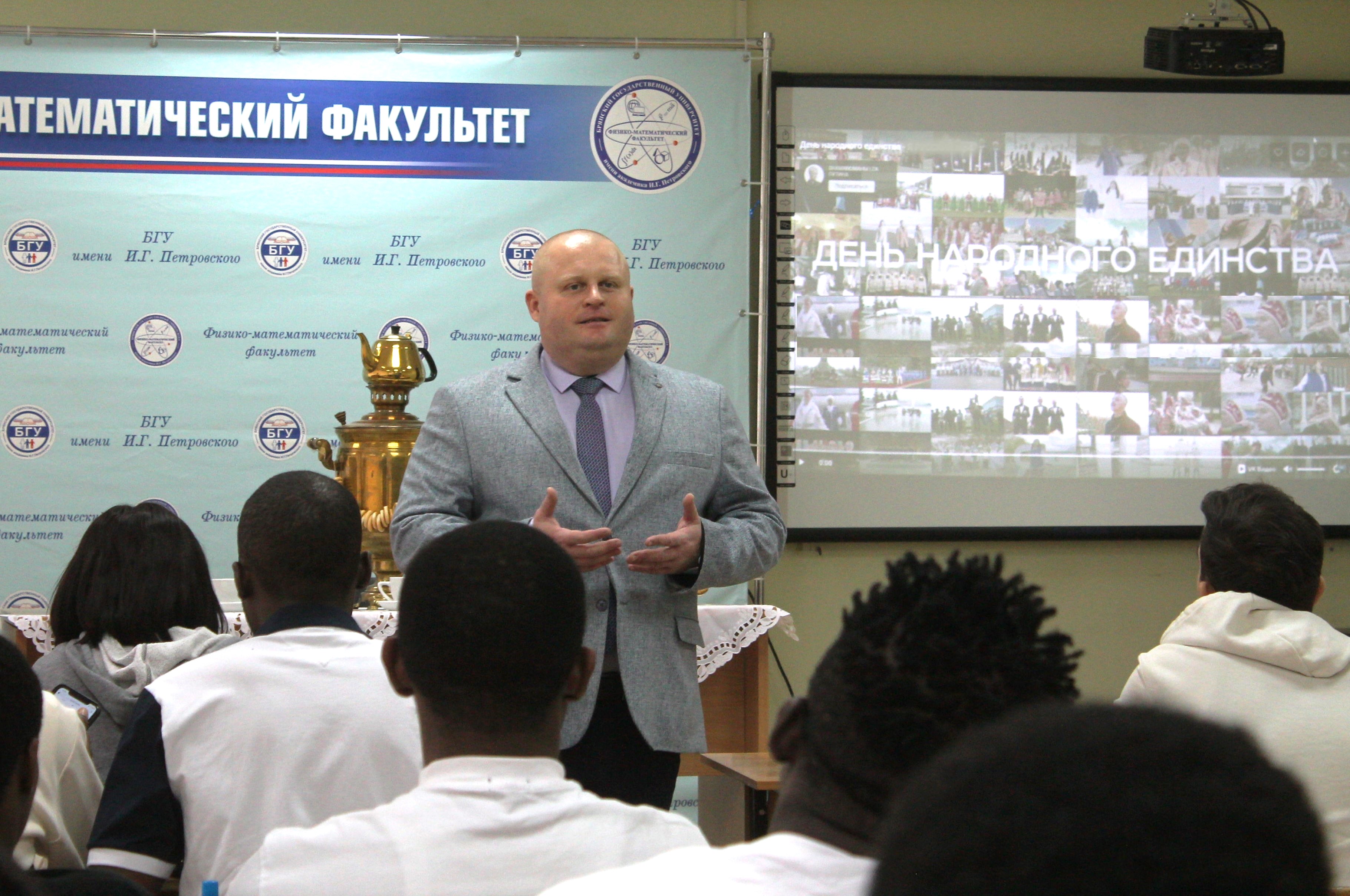 С приветственным словом к участникам мероприятия обратился декан физико-математического факультета А.В. Савин, который обратил внимание иностранных граждан на то, что Россия – многонациональное государство, на территории которой проживает более 190 народов, у каждого из них есть своя культура и традиции. Каждый из жителей страны бережно хранит свою богатую культуру, в том числе национальный костюм, который является бесценным, неотъемлемым достоянием культуры народа, частью традиции, которую надо помнить и свято чтить. Декан факультета также поздравил всех присутствующих с наступающим праздником – Днем народного единства.