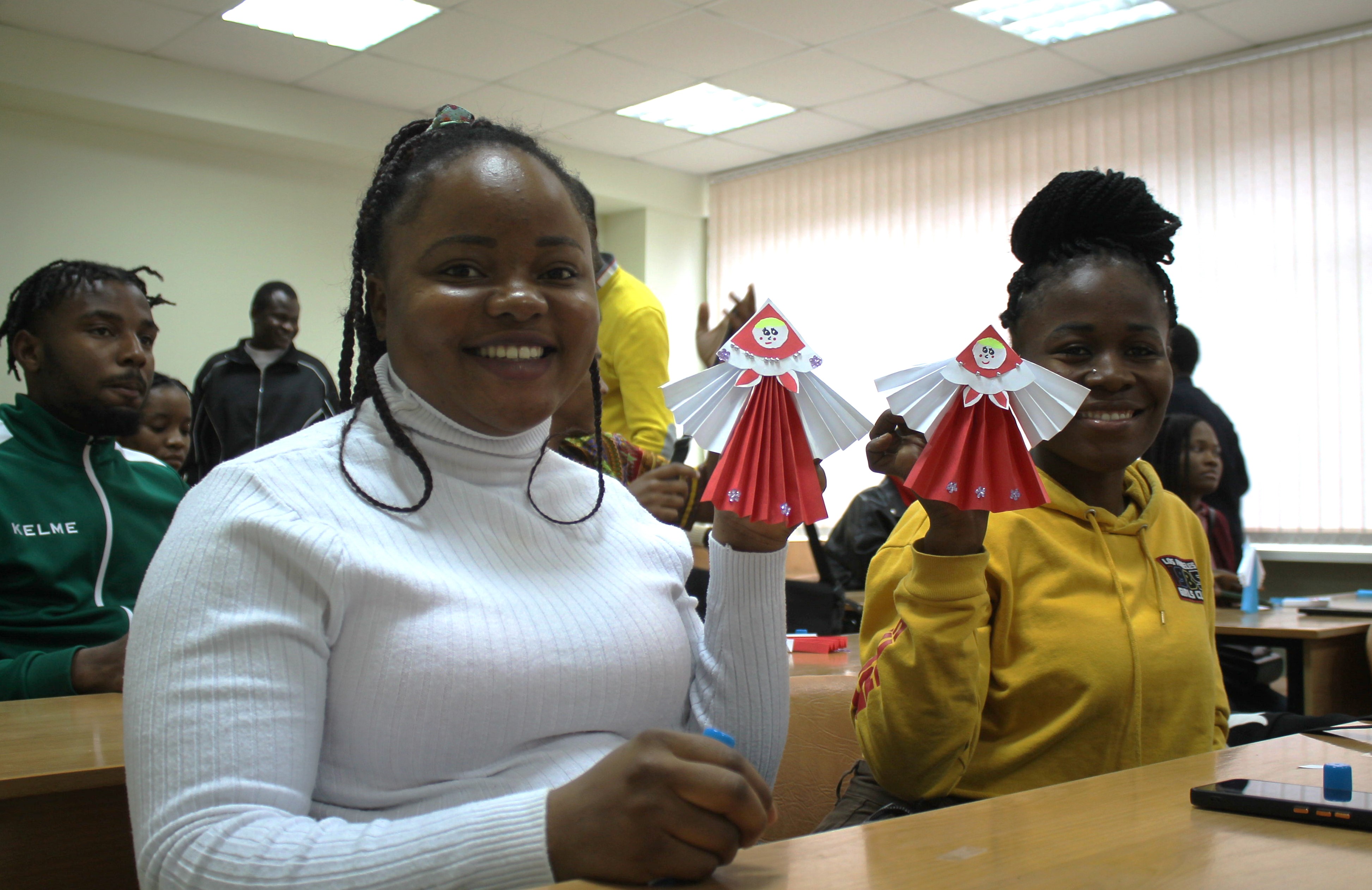 Участники ознакомились с историей национальной одежды, рассмотрели разновидности мужского и женского народного костюма, особенности и значение деталей русского костюма, названия разных его элементов, происхождение традиционных орнаментов, наносимых на костюмы и многое другое. Затем иностранные студенты стали участниками творческой лаборатории, где под руководством студентки 3 курса физико-математического факультета Ю. Корзуновой был организован мастер-класс по изготовлению элементов русского национального фольклорного костюма.