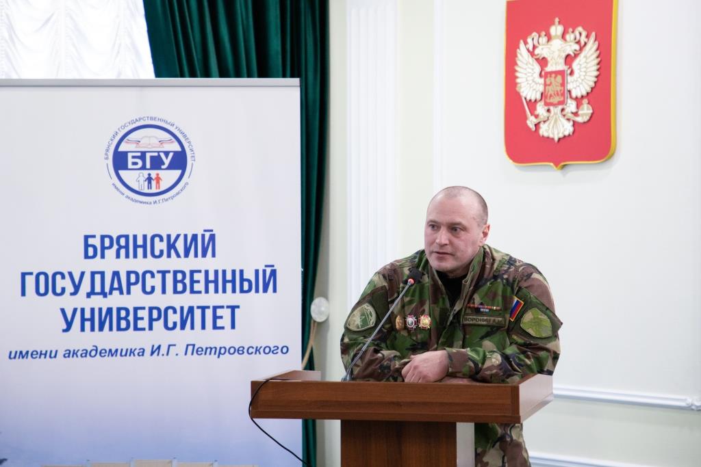 Ещё один гость нашего вуза, Алексей Николаевич Воронин, проходил срочную службу в бригаде специального назначения «Витязь», участвовал в контртеррористической операции на Северном Кавказе, отстаивая территориальную целостность нашего государства. Был ранен. Спустя годы после службы в армии вместе со своими друзьями-соратниками создал в Брянске ветеранскую организацию специального назначения «Витязь». Сегодня при организации создано детско-юношеское движение «Гвардейская смена», с молодёжью проводится большая военно-патриотическая работа. Бывшие воспитанники «Гвардейской смены» учатся в военных училищах и академиях, участвуют в специальной военной операции. Многие ветераны бригады специального назначения и общественного движения «Витязь» ушли на СВО. Алексей Николаевич проходит службу в Управлении Росгвардии по Брянской области, часто, как и всего сослуживцы, бывает на линии боевого соприкосновения с противником, помогает в обеспечении охраны нашей границы.