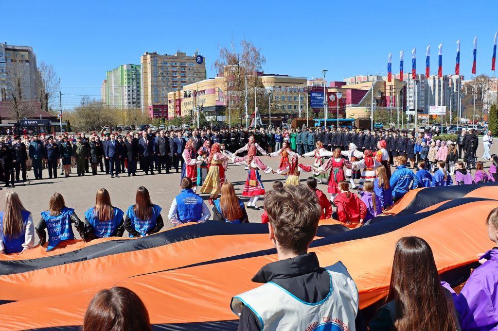 Участники всероссийского общественного движения «Волонтеры Победы» развернули 25-метровое полотнище георгиевской ленточки. Все присутствующие в дань уважения к подвигам отцов и дедов прикрепили георгиевские ленточки на одежду.