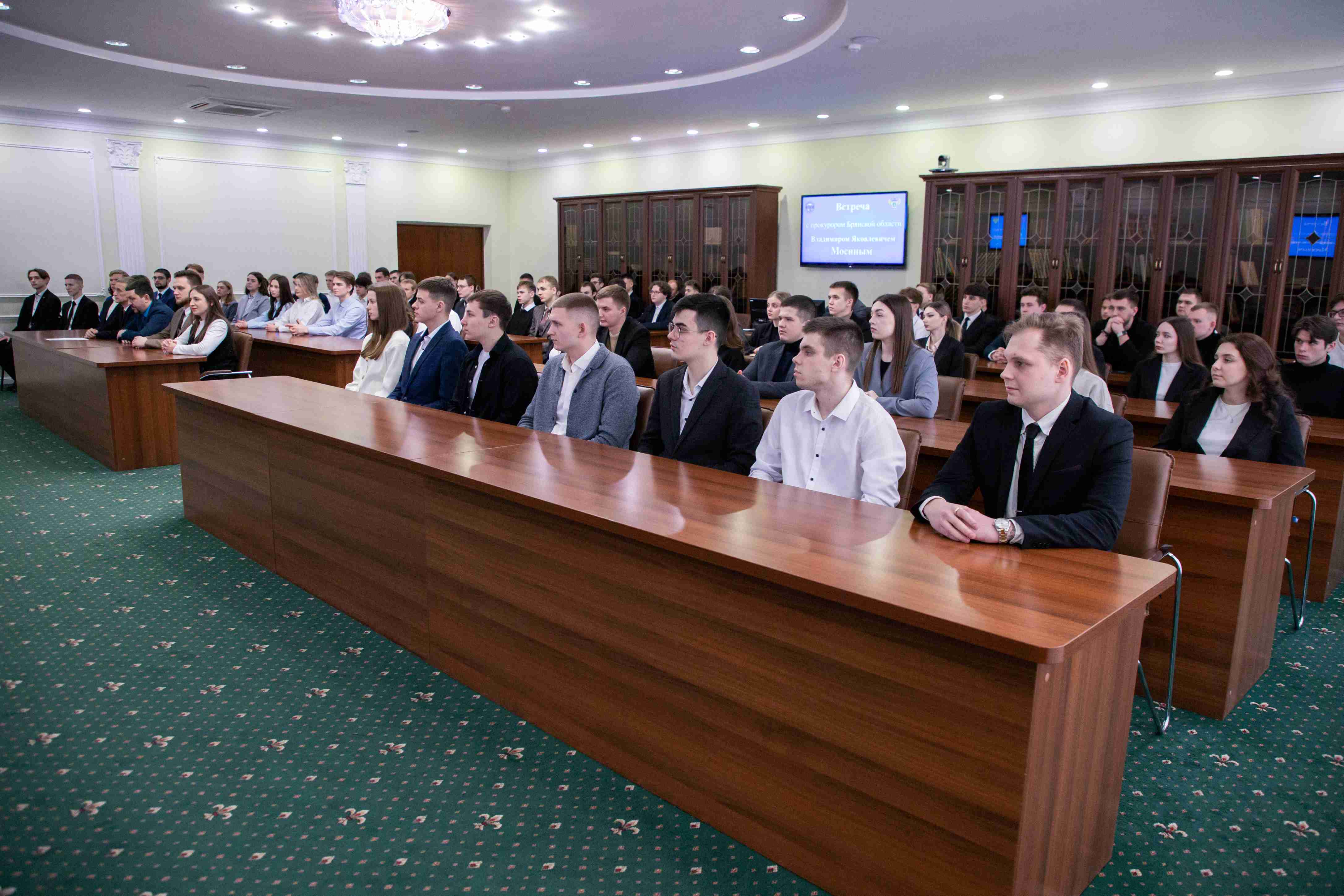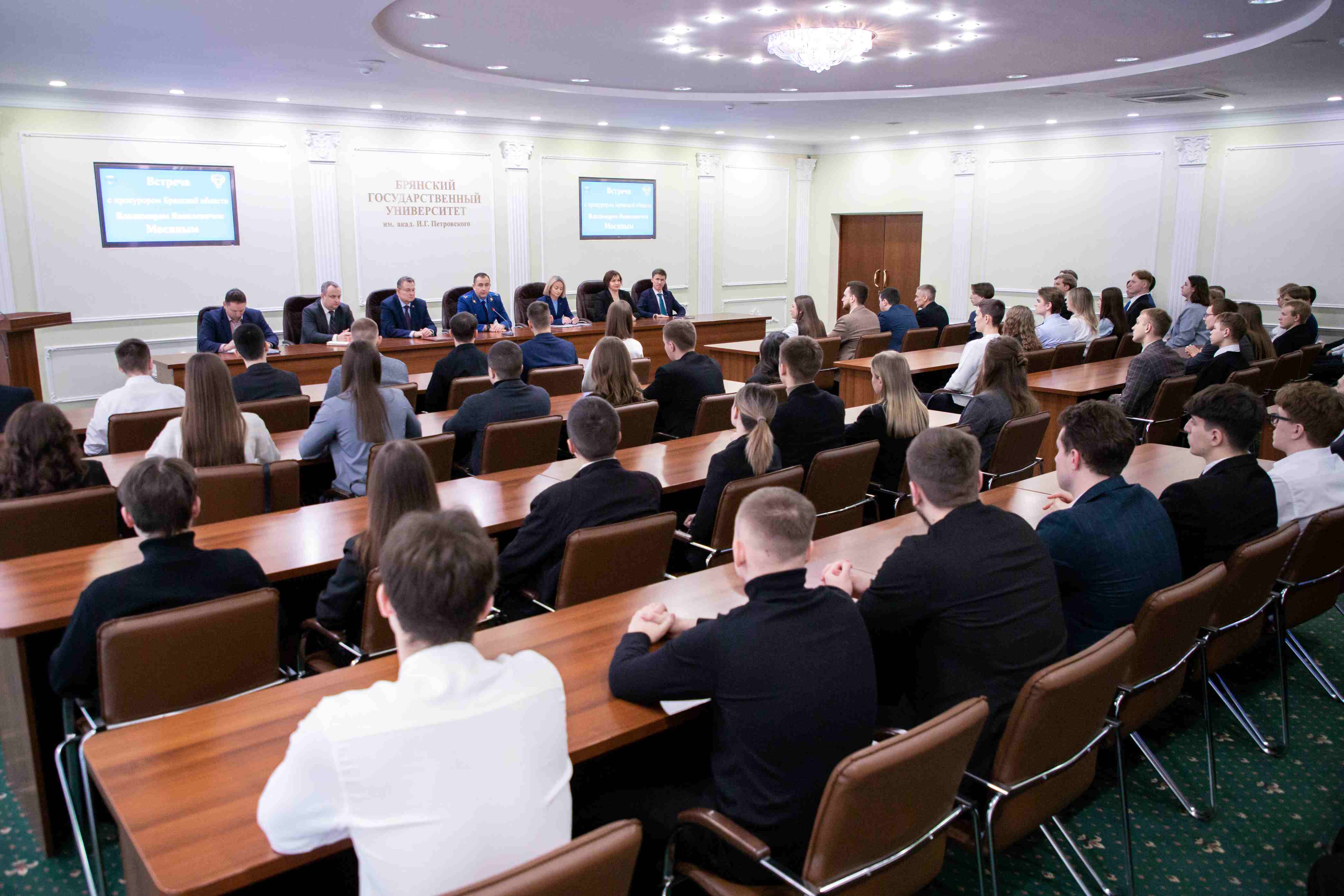 Именно в этом ключе и следует рассматривать прошедшую в конференц-зале университета встречу студентов старших курсов юридического факультета с прокурором Брянской области, старшим советником юстиции Владимиром Яковлевичем Мосиным. Подобного рода неформальное общение с руководителем надзорного ведомства позволяет будущим служителям закона познакомиться с представителями профессии, узнать у потенциальных работодателей о профессиональных тонкостях, о личных и деловых качествах прокурорских работников.