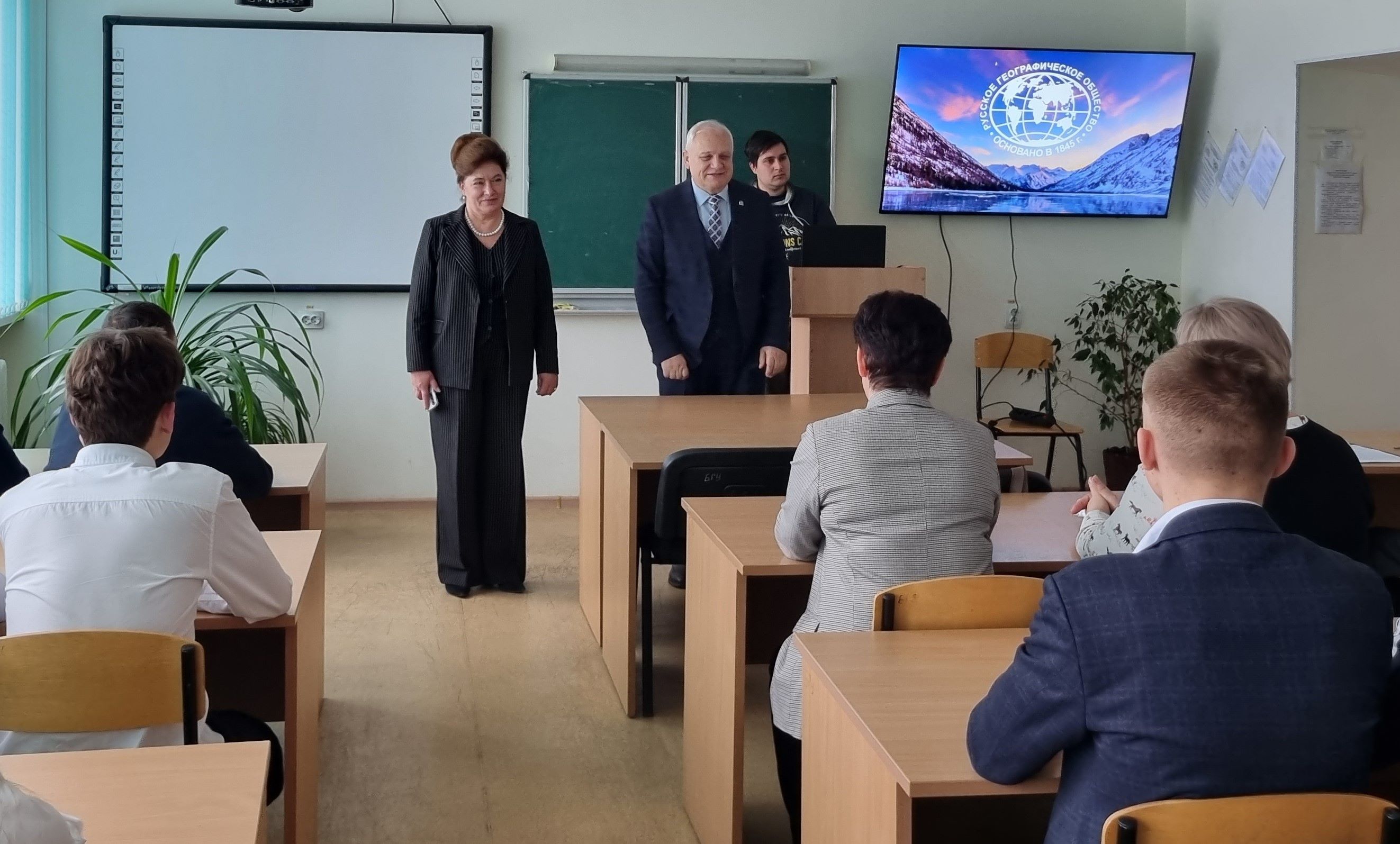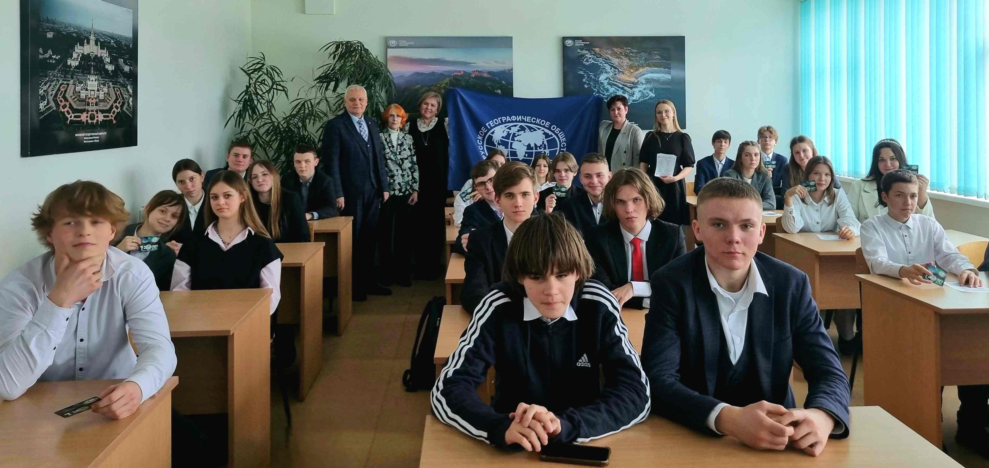 Потворов А.И. рассказал обучающимся об одном из направлений деятельности РГО по популяризации географии среди молодежи, реализации их научного и творческого потенциала в области географии и смежных отраслей знаний, вовлечению в волонтерскую деятельность и участию в проектах Общества – Молодежном движении.