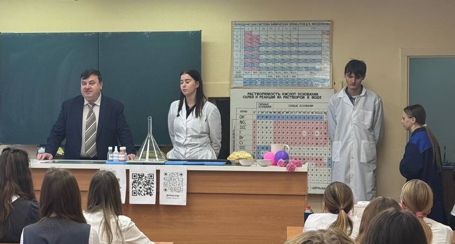 27 ноября стал по-настоящему "химическим" днём для учащихся школы № 49, которую посетили студенты кафедры химии под руководством Лукашова С.В., Кузнецова С.В., Исаева Р.И., Рыженко О.С., Баранова Д.С. Целью этого визита было не только продемонстрировать увлекательную сторону науки, зажечь искру интереса к химии среди школьников, показав, как теория воплощается в ярких и запоминающихся экспериментах, но и познакомить учащихся с условиями поступления на направления подготовки естественно-географического факультета.