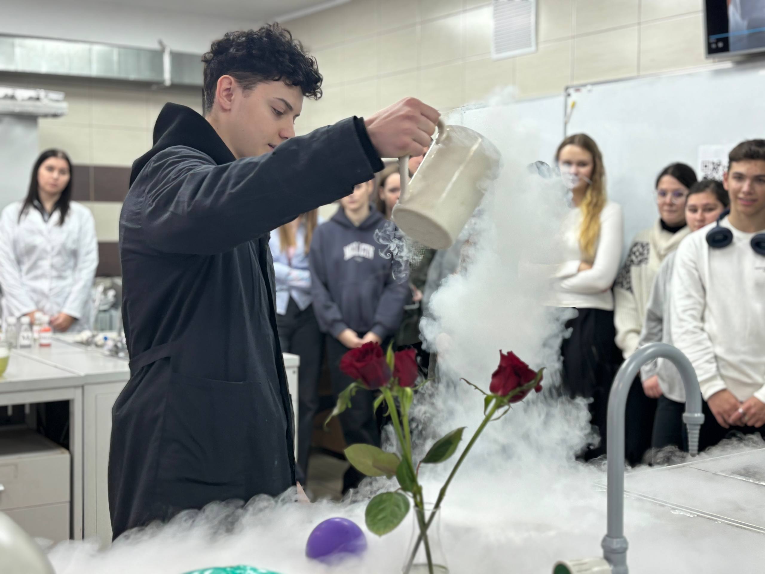 «Хрупкая роза» и жидкий азот. Школьники с восторгом наблюдали за экспериментами с жидким азотом. Один из самых эффектных опытов – погружение живой розы в жидкий азот, где при температуре около -196 °C она мгновенно становилась хрупкой и легко разбивалась на тысячи осколков, демонстрируя удивительные изменения физических свойств материалов при экстремально низких температурах.