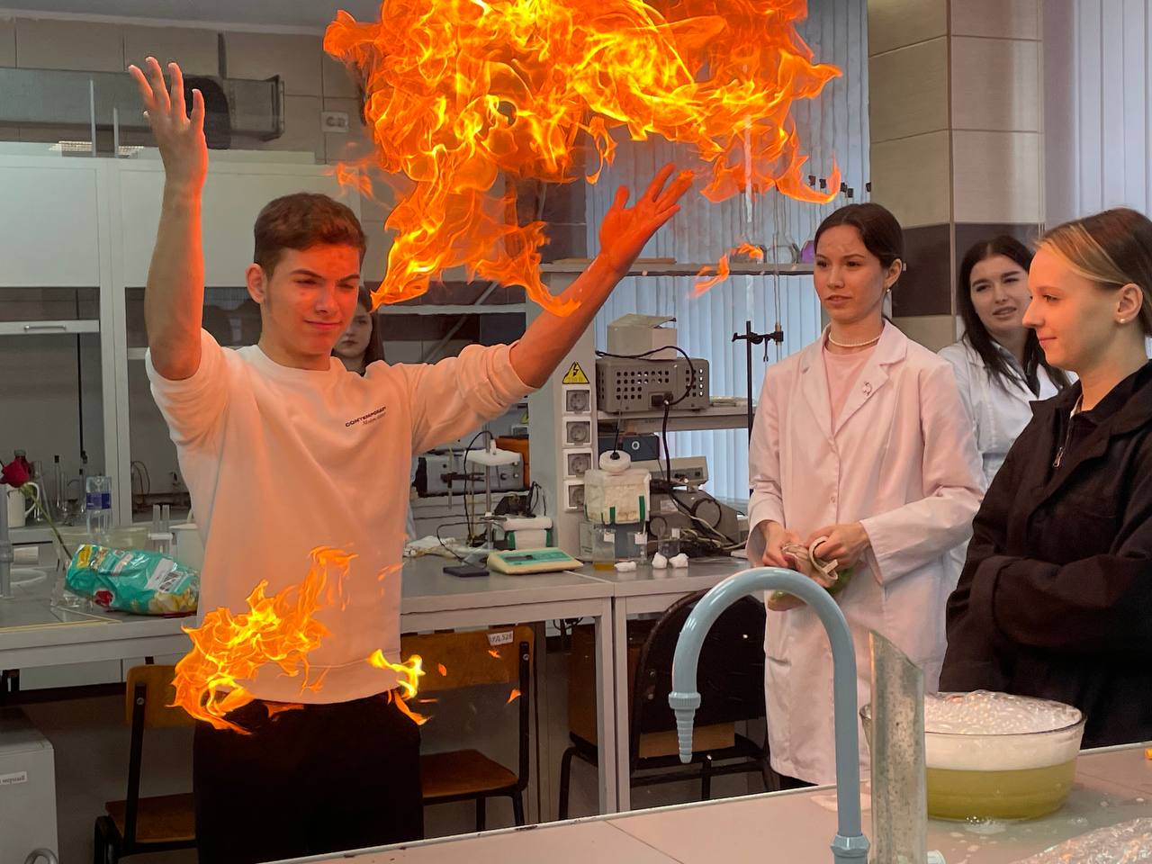 И, конечно же, не обошлось без волшебства мыльных пузырей, но не простых. С помощью аппарата Киппа студенты генерировали водород, который затем пропускали через мыльный раствор. Результатом стали не просто пузыри, а целые облака легких, парящих в воздухе сфер, эффектно сгорающих в пламени.