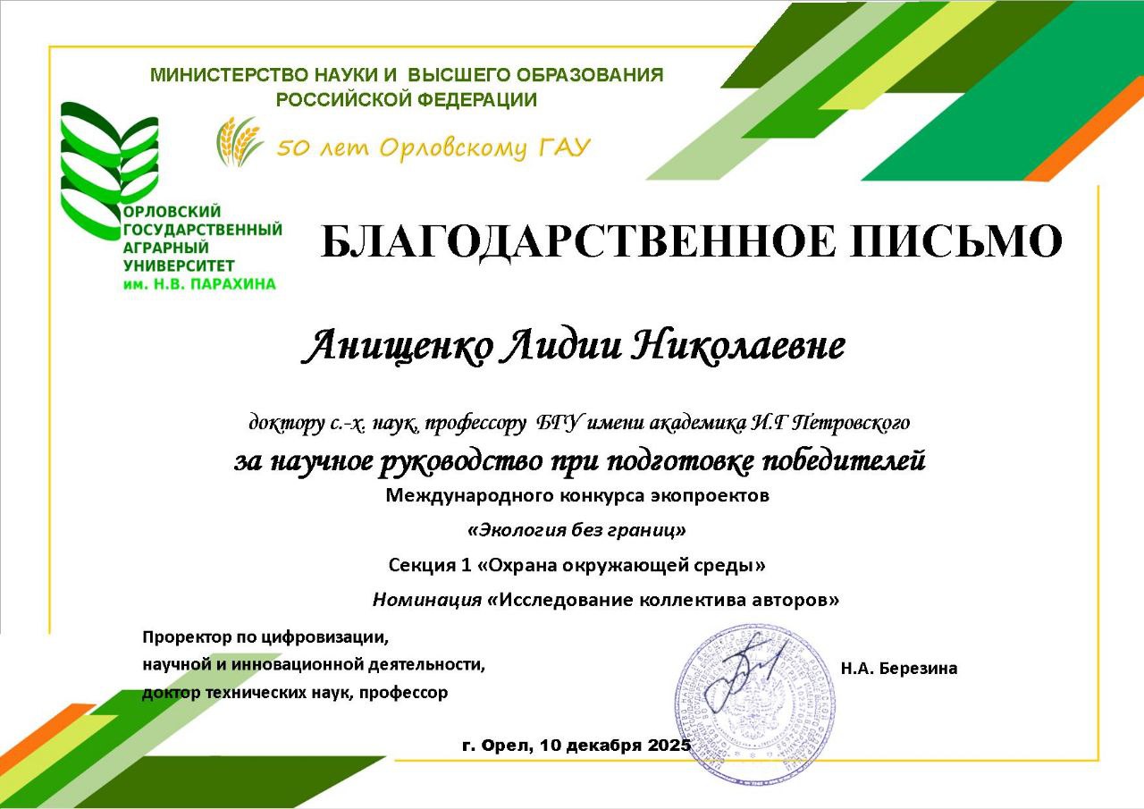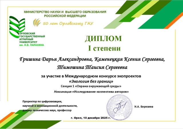 Студенты направления 05.03.06 Экология и природопользование приняли участие в международном конкурсе экопроектов, прошедшем в ФГБОУ ВО «Орловский государственный аграрный университет имени Н.В. Парахина» (1-10.12.2025 г.).