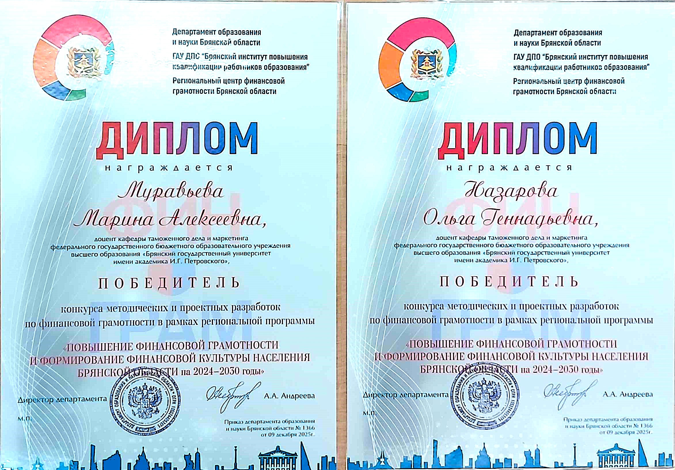 В этом состязании профессионального мастерства успешно выступили представители Брянского государственного университета имени академика И.Г. Петровского. В номинации «Лучший методический материал по финансовой грамотности для учреждений высшего образования» победу одержали доценты кафедры таможенного дела и маркетинга финансово-экономического факультета ФГБОУ ВО «Брянский государственный университет имени академика И.Г. Петровского» М. А. Муравьева и О. Г. Назарова. Их конкурсной работой стала методическая разработка «Формирование финансовой грамотности обучающихся через проектную деятельность по созданию бизнес-плана».