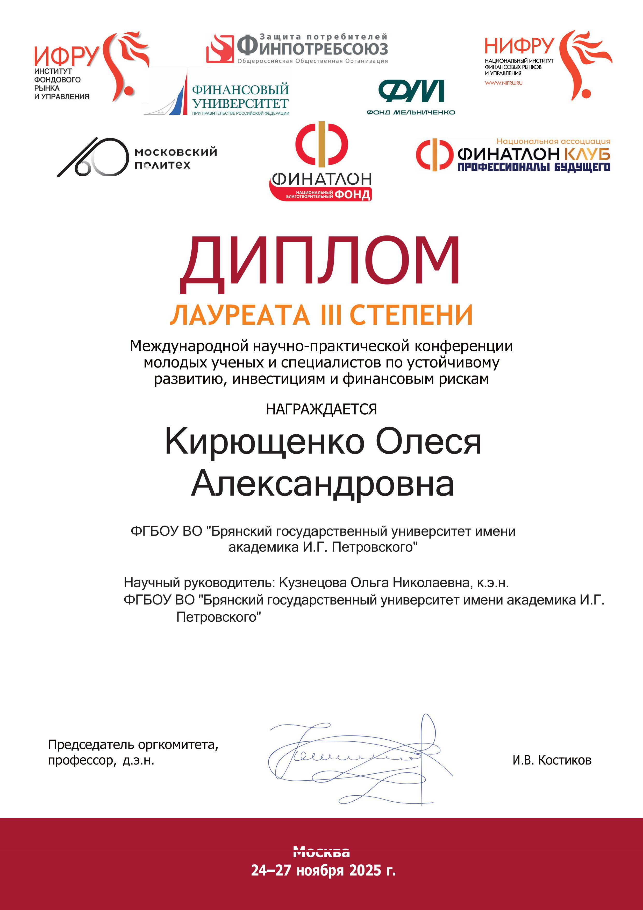 Студентка 3 курса специальности «Экономическая безопасность» ФГБОУ ВО «Брянский государственный университет им. академика И.Г. Петровского» Кирющенко Олеся Александровна стала лауреатом третьей степени по итогам Международной научно-практической конференции молодых ученых и специалистов по устойчивому развитию, инвестициям и финансовым рискам в рамках VII Финатлон форума «Профессионалы будущего», который уверенно закрепился как ключевая точка притяжения для талантливых молодых исследователей, ведущих работодателей и передовых университетов России и дружественных стран. Это не просто конкурс научных работ – это витрина нового поколения экспертов по устойчивому развитию, финансам, цифровым технологиям и социально-экономическим трансформациям, где будущие лидеры демонстрируют свои компетенции тем, кто принимает решения сегодня.