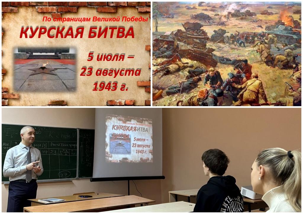 Преподаватели кафедры таможенного дела и маркетинга продолжают цикл мероприятий, посвященных 80-й годовщине Победы в Великой Отечественной войне и Году Защитника Отечества. 26 ноября 2025 г. доцент кафедры Р.А. Бандурин провел для студентов первой группы 4 курса специальности «Таможенное дело» очной формы обучения кураторский час «Курская битва. По страницам Великой Победы». Вслед за рассказчиком юноши и девушки проследили по карте Курской дуги направления главных ударов немецких захватчиков и ответных действий Советской армии. Они узнали, что начавшееся 5 июля 1943 года масштабное сражение вошло в историю как величайшее танковое сражение Второй Мировой войны. Недаром историки включают танковую битву на Прохоровском поле в число трех главных ратных полей России наряду с Куликовым полем и Бородино.