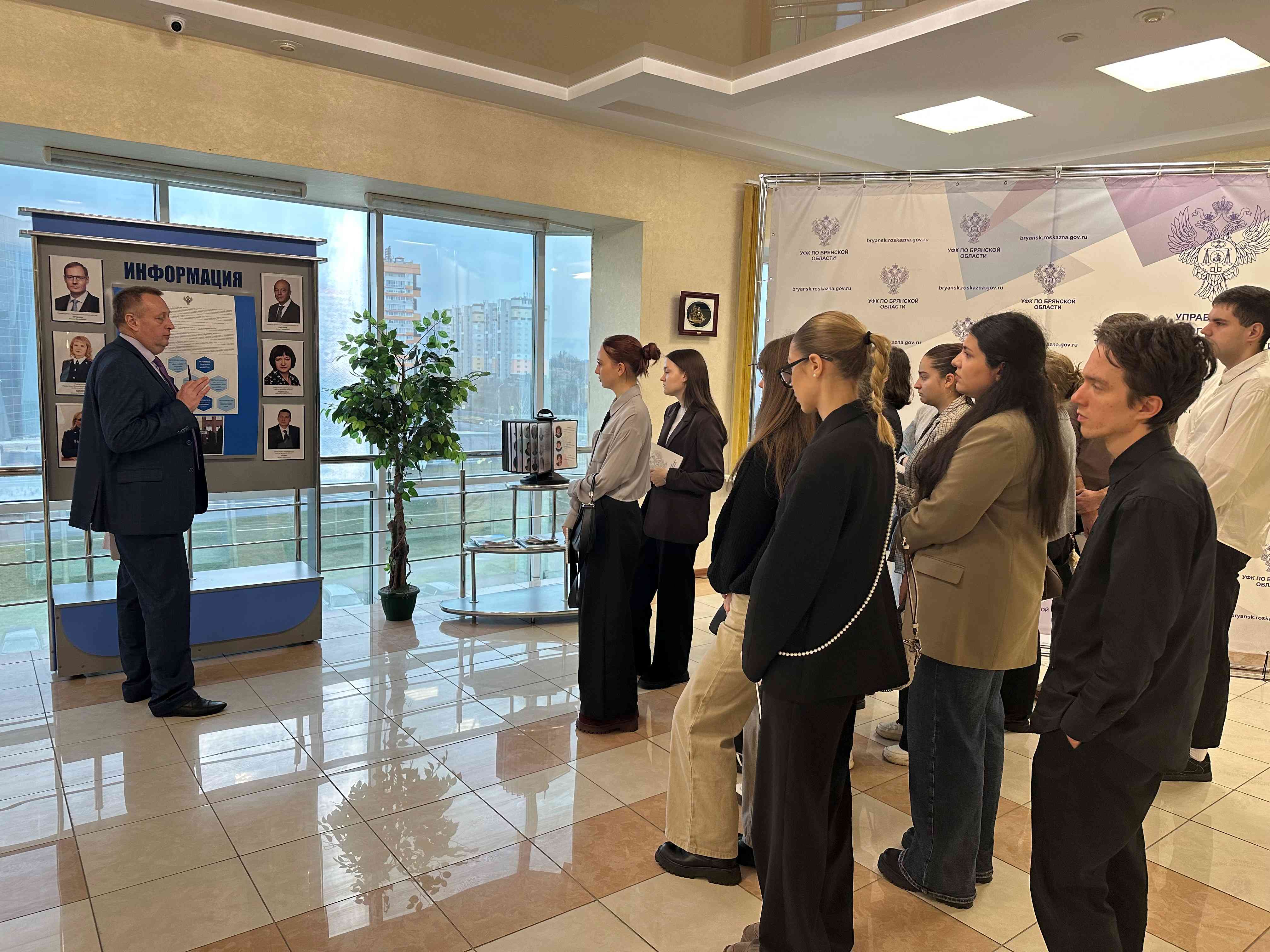 Яськов Сергей Дмитриевич, начальник отдела государственной гражданской службы и кадров, и Мерзлюкина Евгения Александровна, председатель Молодёжного совета, рассказали об исторических вехах развития и функционирования Федерального Казначейства в Брянской области, провели экскурсию по музею Федерального Казначейства, рассказали о спортивных мероприятиях, экологических и благотворительных акциях, которые проводит Управление.