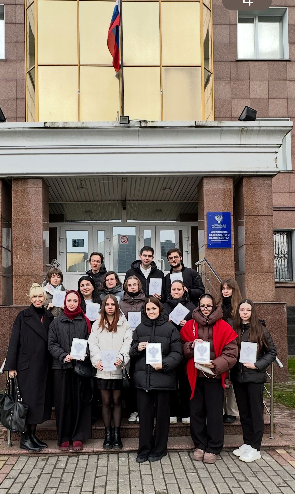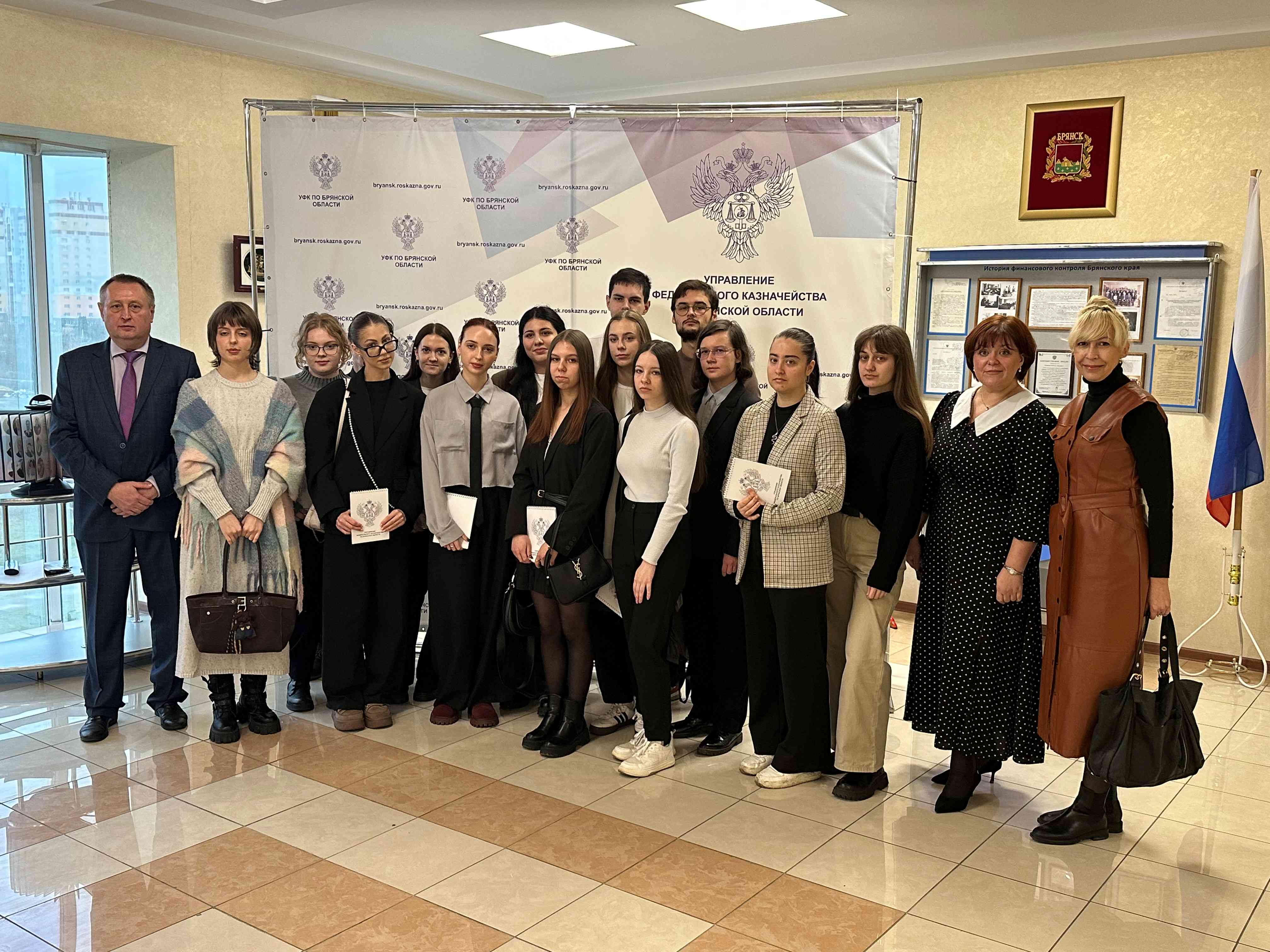 28 ноября 2025 г. студенты 3 курса направления подготовки «Экономика» профиль «Финансы и кредит» и «Бухгалтерский учёт, анализ и аудит» с заместителем декана по учебной и научной работе финансово-экономического факультета Дворецкой Ю.А. посетили Управление Федерального Казначейства по Брянской области.