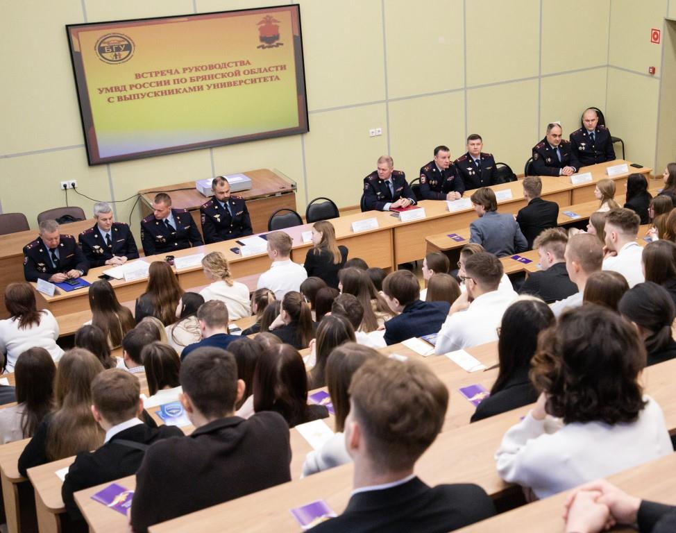 В Брянском государственном университете имени академика И.Г. Петровского состоялась встреча студентов юридического и финансово-экономического факультетов с руководителями основных служб и подразделений УМВД России по Брянской области. Мероприятие носило профориентационный характер.