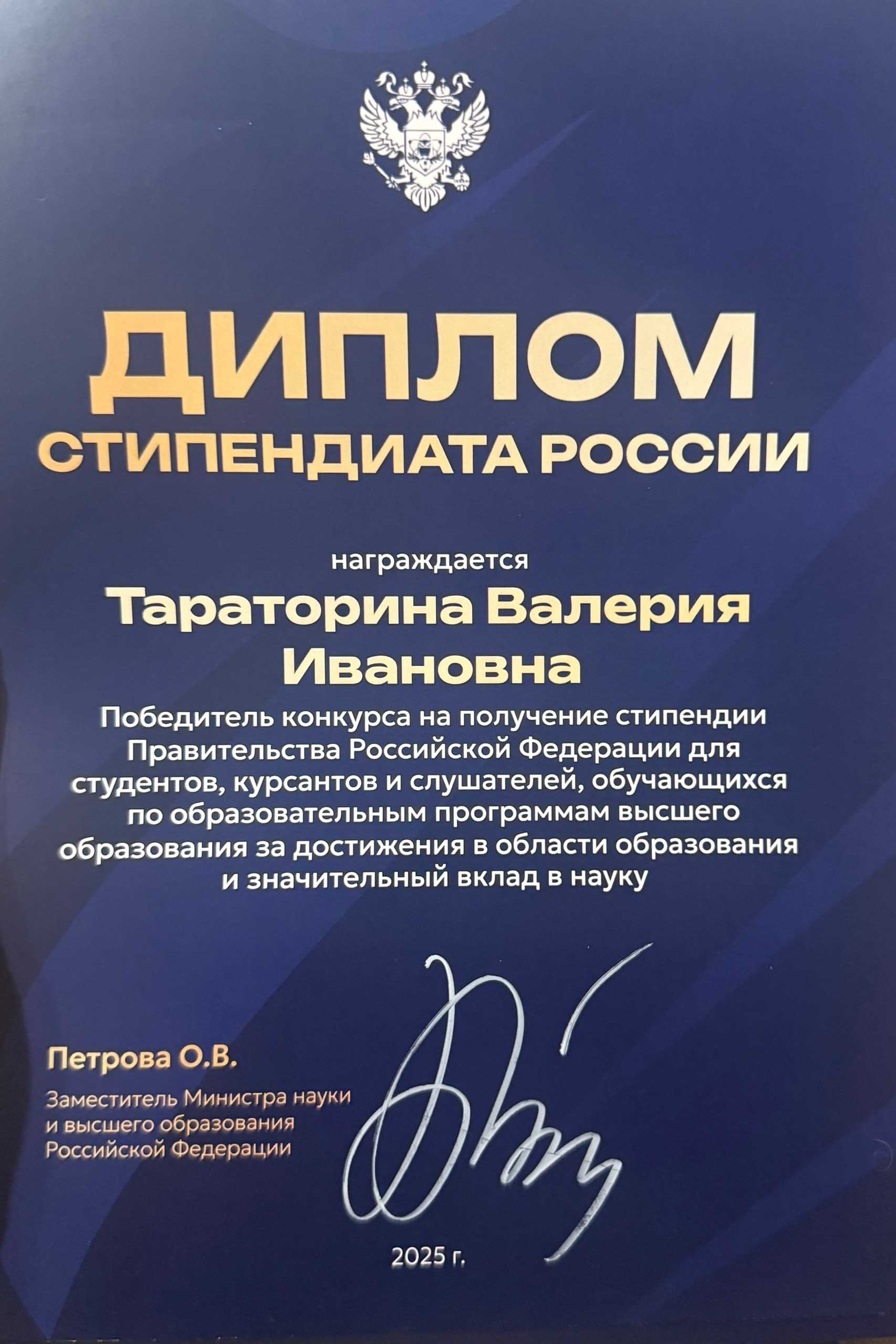 Победителем конкурса на получение стипендии Правительства Российской Федерации для студентов, курсантов и слушателей, обучающихся по образовательным программам высшего образования за достижения в области образования и значительный вклад в науку, стала студентка 3 курса филологического факультета нашего университета Тараторина Валерия.