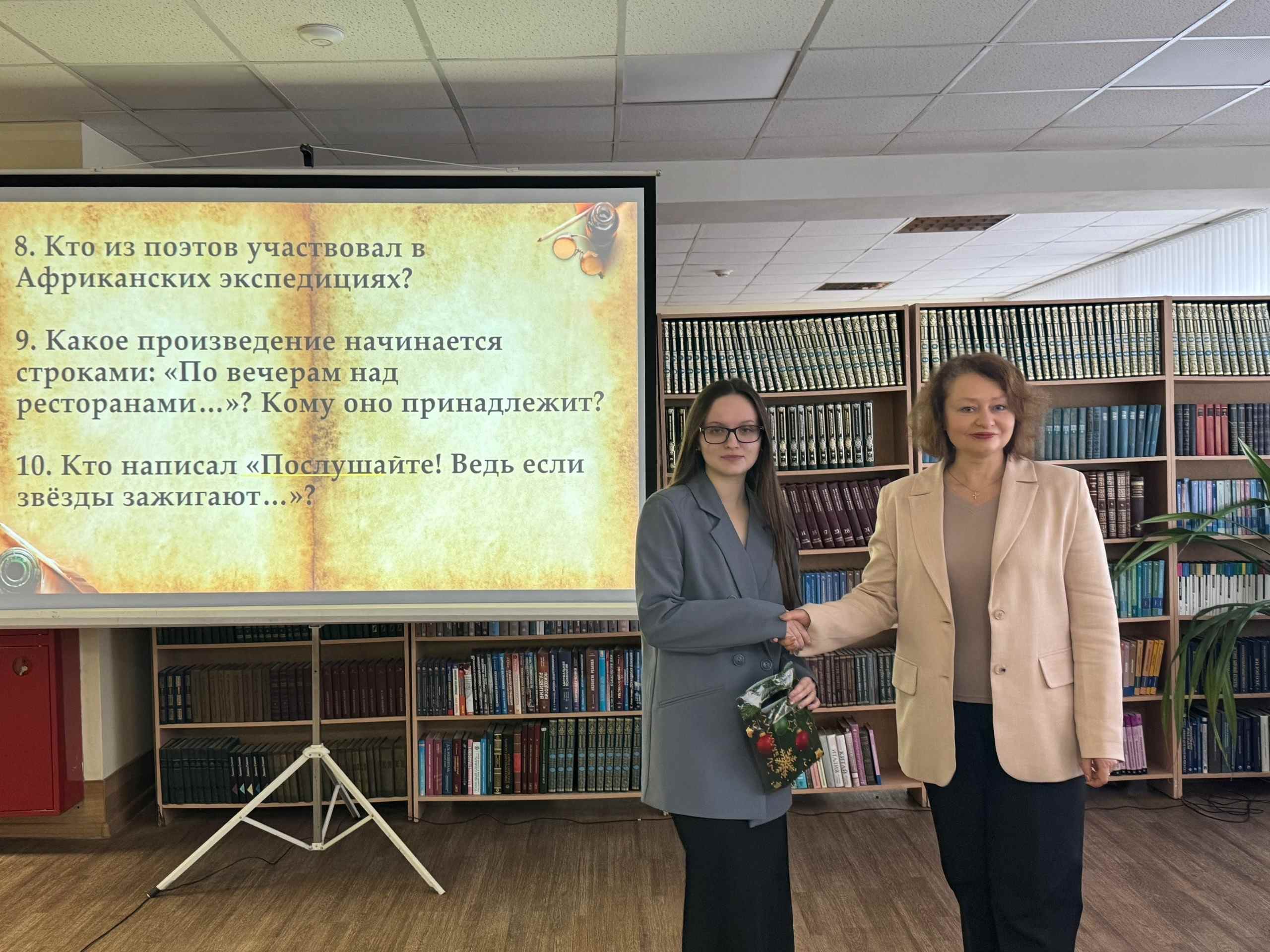 Для школьников была проведена викторина на знание лирических произведений поэтов Серебряного века. По её итогам особыми призами были награждены учащиеся, набравшие большее количество баллов. Также награду за волшебное исполнение получила и студентка 4 курса Емельяненкова Анна.