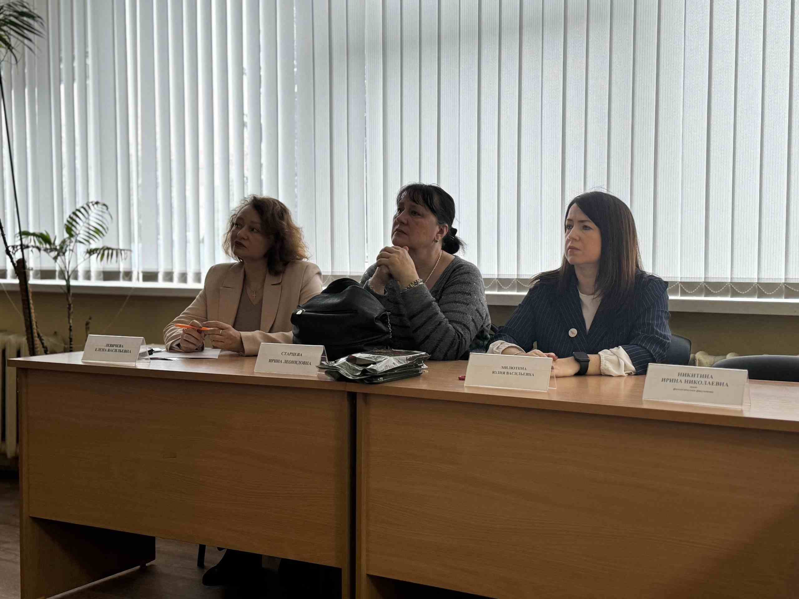 На встрече присутствовали: декан нашего факультета, кандидат филологических наук доцент И.Н. Никитина; заместитель декана по учебной и научной работе, кандидат экономических наук, доцент Е.Н. Якубенко; исполняющий обязанности заведующего кафедрой русской, зарубежной литературы и массовых коммуникаций, кандидат филологических наук, доцент Е.В. Левичева; заведующий кафедрой русского языка кандидат филологических наук, доцент Н.В. Трошина; исполняющий обязанности заместителя декана по воспитательной, внеучебной работе и общим вопросам Ю.В. Милютина.