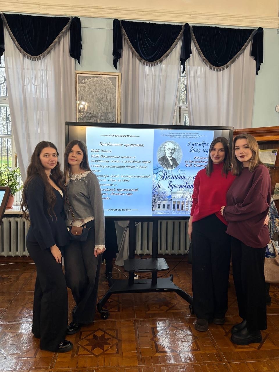 Студенты приняли участие в насыщенной праздничной программе «Поэт и вдохновитель», с самого начала погрузившись в атмосферу XIX века. Торжественная церемонии возложения цветов к памятнику Ф.И. Тютчева в усадебном парке позволила ощутить «связь времен» - прошлого и настоящего.
