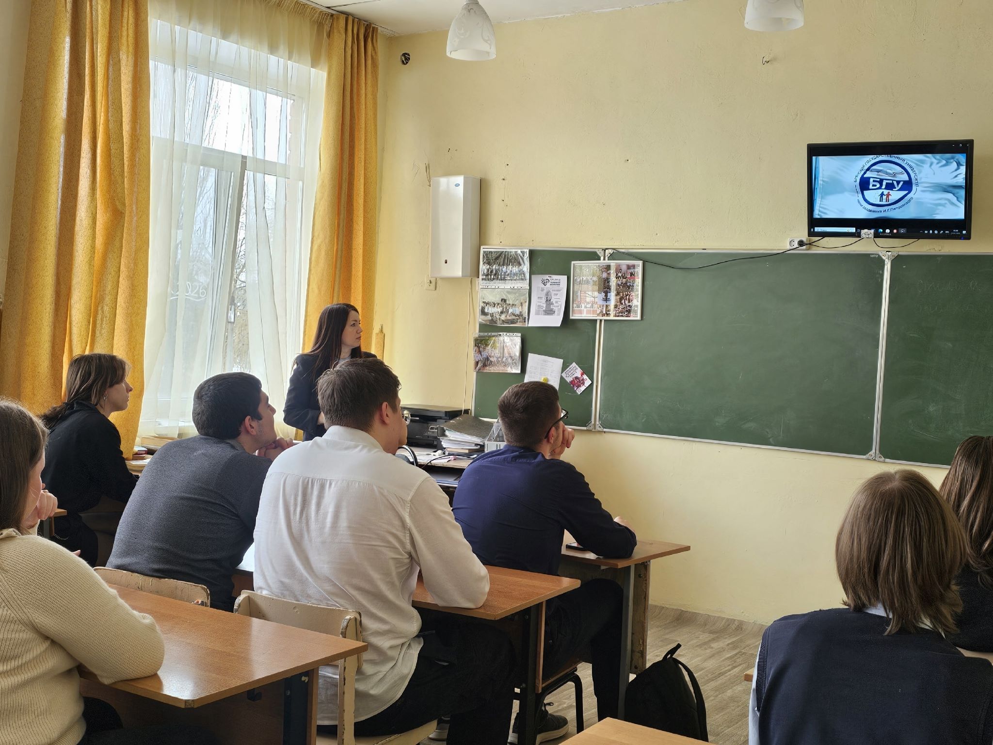 18 марта 2026 года студенты 4 курса филологического факультета Брянского государственного университета имени академика И.Г. Петровского под руководством доцента кафедры русского языка, кандидата филологических наук О.Ю. Печенкиной провели профориентационное мероприятие в МБОУ «СОШ № 1» г. Брянска на тему: «БГУ – вуз для тех, кто верит в себя и стремится к успеху!».
