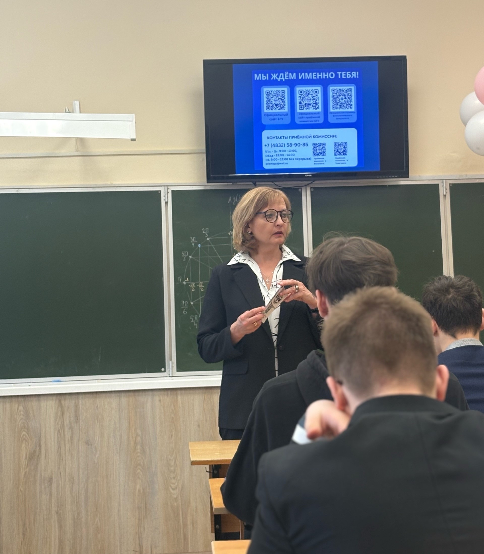 Доцент кафедры русского языка, кандидат филологических наук Печенкина Ольга Юрьевна познакомила обучающихся с направлениями и профилями, на которые будет осуществляться прием абитуриентов в Брянский государственный университет имени академика И.Г. Петровского в 2026 году, а также с правилами приема.