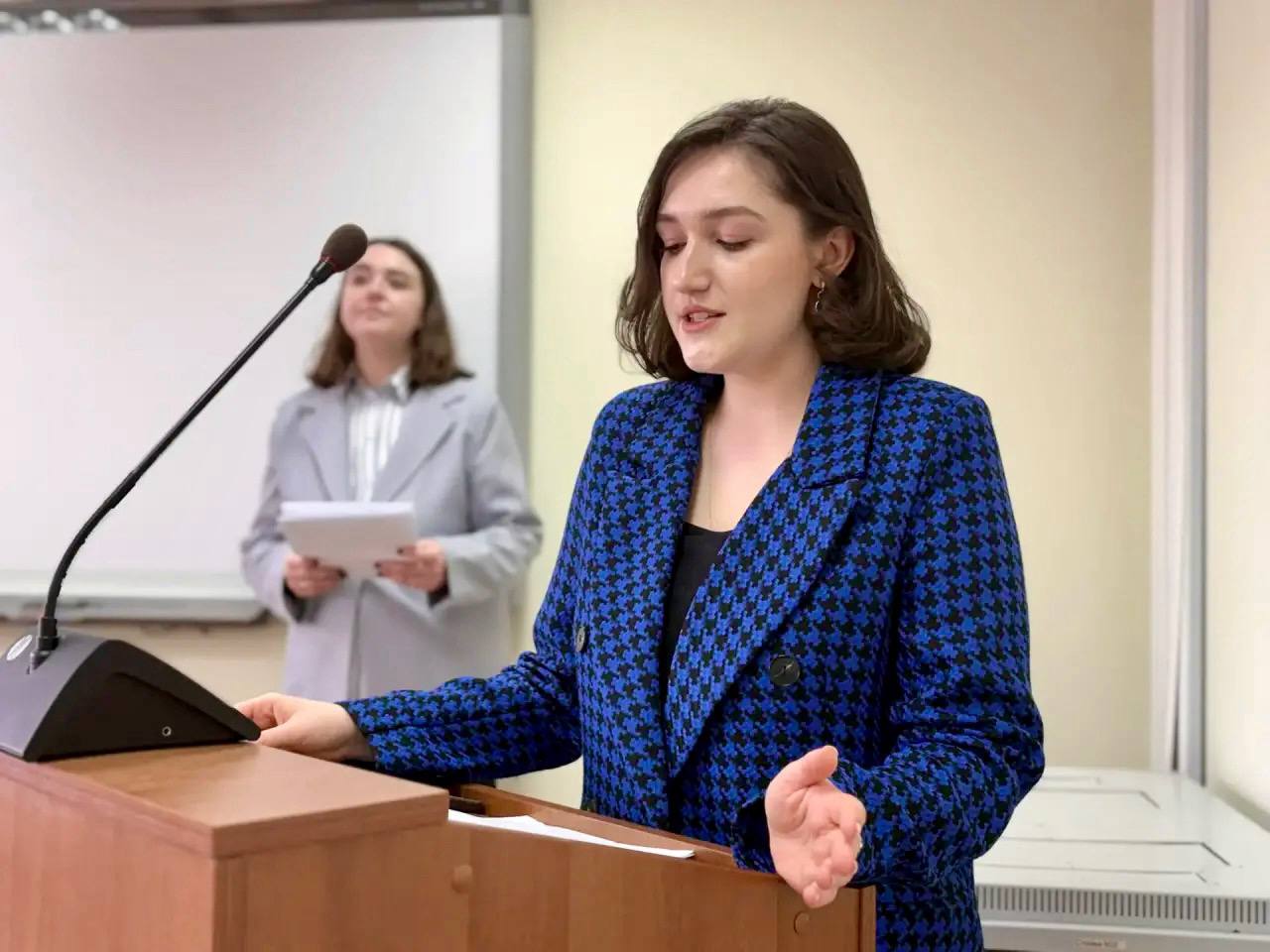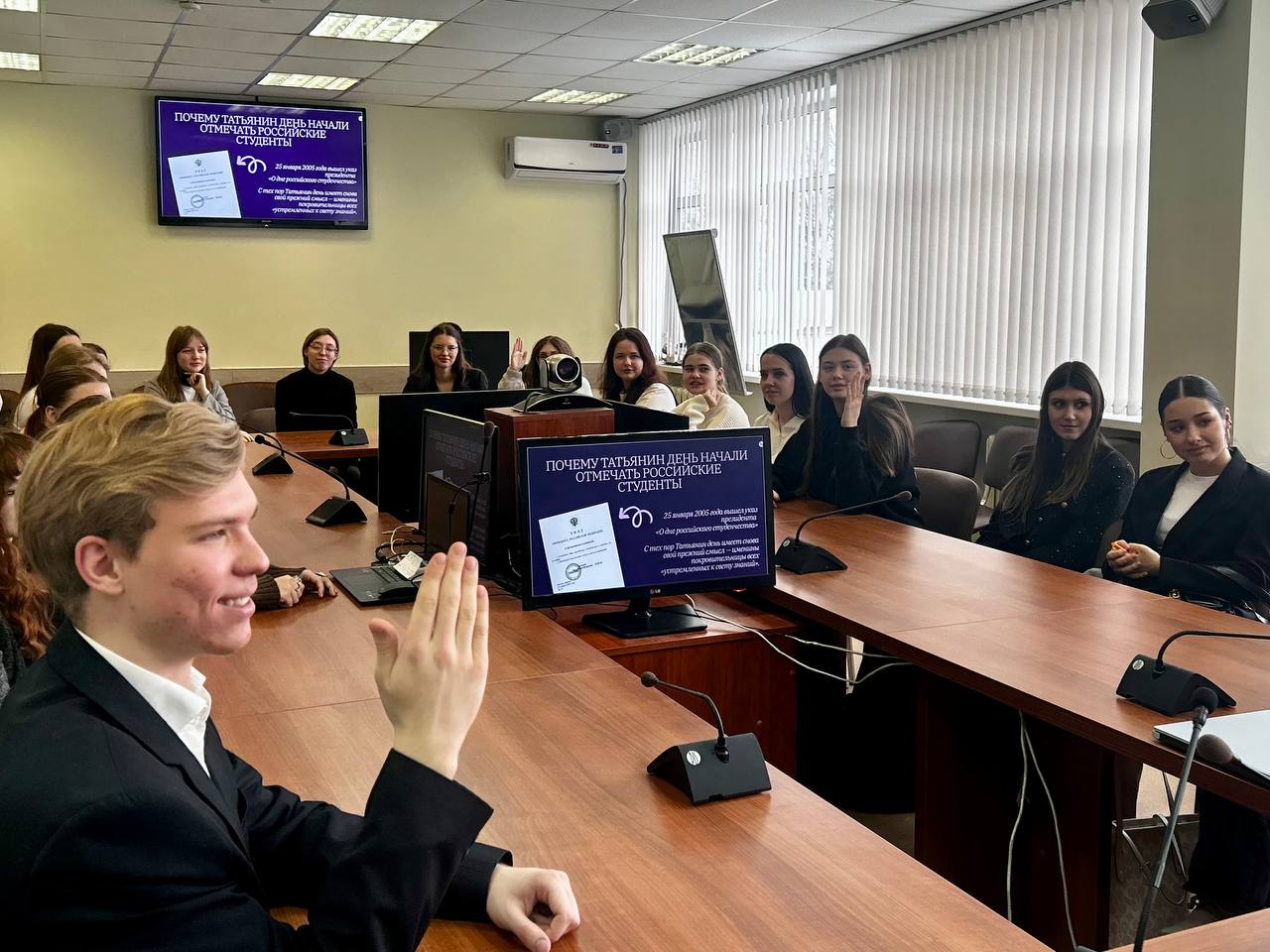 Т. Сулима, председатель Студенческого совета филологического факультета, представила презентацию, в которой рассказала об истоках праздника: от истории Святой мученицы Татианы Римской, чья память чтится в этот день, до указа императрицы Елизаветы Петровны об учреждении Московского университета, который и положил начало традиции празднования «профессионального» дня студентов.