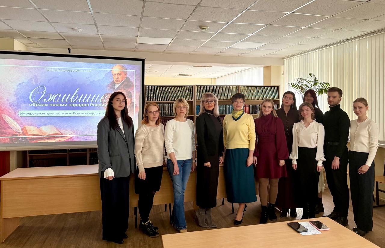 17 марта 2026 года в читальном зале университета в рамках мероприятий, приуроченных к Году единства народов России, и в преддверии Всемирного дня поэзии студенты 5 курса факультета иностранных языков под руководством заместителей декана Клименко М.В. и Изотовой Н.В. провели иммерсивное путешествие «Ожившие образы поэзии народов России».