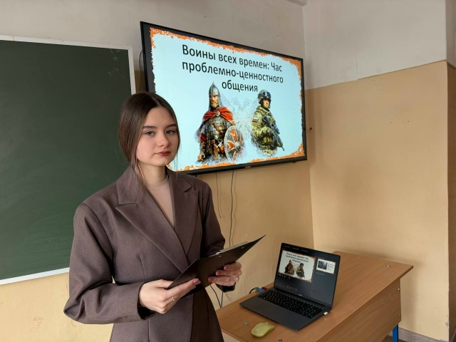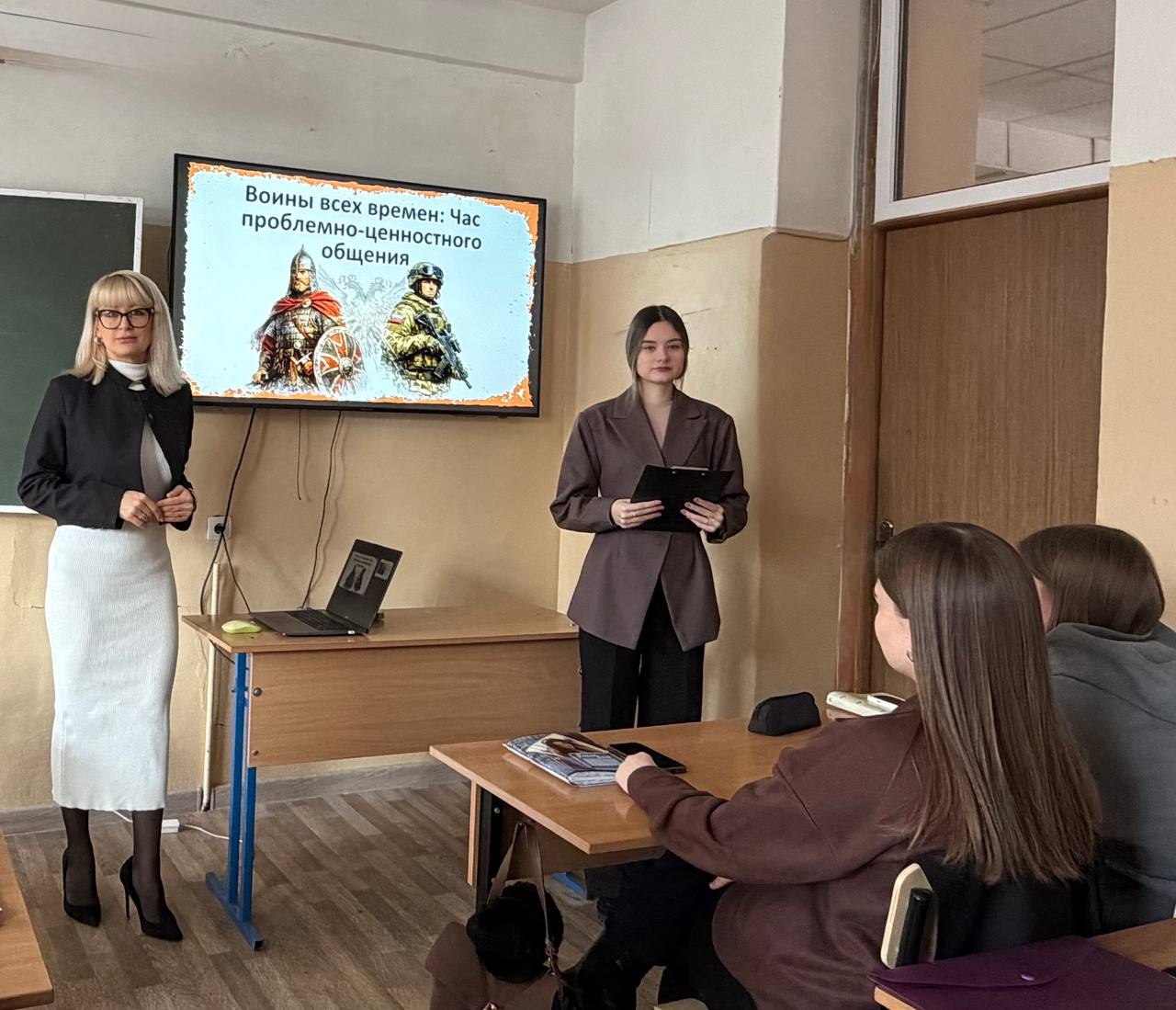 Час проблемно-ценностного общения «Воины всех времен» перенес участников на Куликово поле, в окопы 1812 года и на фронты Великой Отечественной. Студенты вспомнили имена, которые знает каждый: Александр Невский, Пересвет и Ослябя, Михаил Кутузов, Георгий Жуков. Говорили и о тех, кто сегодня стоит на страже Родины.