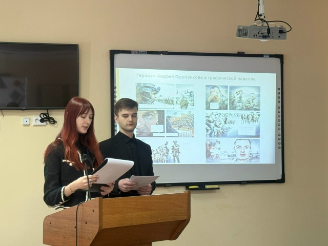 19 февраля в преддверии Дня защитника Отечества в стенах факультета прошел патриотический час «Герои живут рядом», который стал не просто лекцией, а настоящим разговором о чести, долге и мужестве. На мероприятии присутствовали заместитель директора русской и романо-германской филологии Логутова О.Н., заместитель декана Клименко М.В., куратор 4 курса Циколенко Л.И.