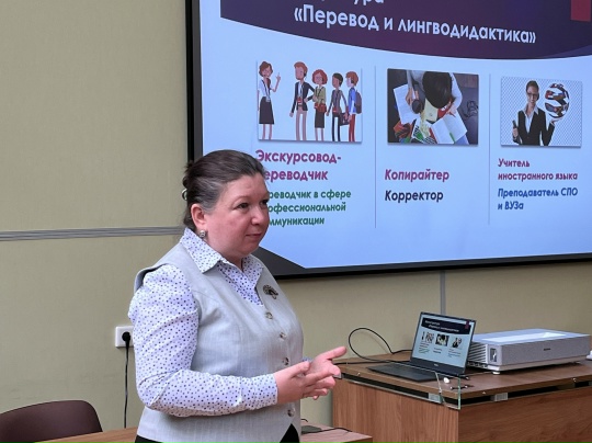 Селифонова Елена Дмитриевна, кандидат филологических наук, доцент кафедры теории английского языка и переводоведения представила магистерскую программу 45.04.02 Лингвистика (направленность Перевод и лингводидактика) и рассказала студентам о возможностях карьеры переводчика-исследователя в современном мире технологий.