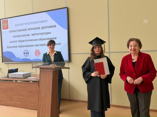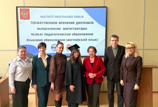 20 марта на факультете иностранных языков состоялось торжественное вручение дипломов выпускникам магистратуры 2025 года. Дипломы магистров получили 6 студентов факультета иностранных языков, освоивших образовательную программу 44.04.01 Педагогическое образование, профиль Языковое образование (английский язык) по заочной форме обучения, из них 3 человека получили диплом с отличием.