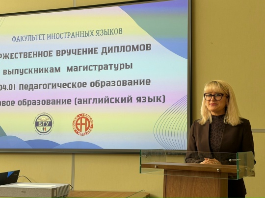 Со словами благодарностям к преподавателям, ректорату университета обратилась выпускница факультета иностранных языков Л.А. Базылова, к.ф.н., учитель иностранных языков высшей категории, заместитель директора по воспитательной работе Дятьковской СОШ №1. Людмила Анатольевна подчеркнула, что университет является кузницей кадров для образовательных учреждений региона и страны: по ее наблюдениям, самые талантливые учителя - это выпускники БГУ. Выпускница 2025 года А.Д. Андрюшина сказала, что мечтает стать профессионалом, и поэтому она продолжила обучение в магистратуре факультета иностранных языков. Обучающиеся факультета пригласили всех присутствующих на карнавал иностранных языков и исполнили песни на английском, французском, немецком языках.