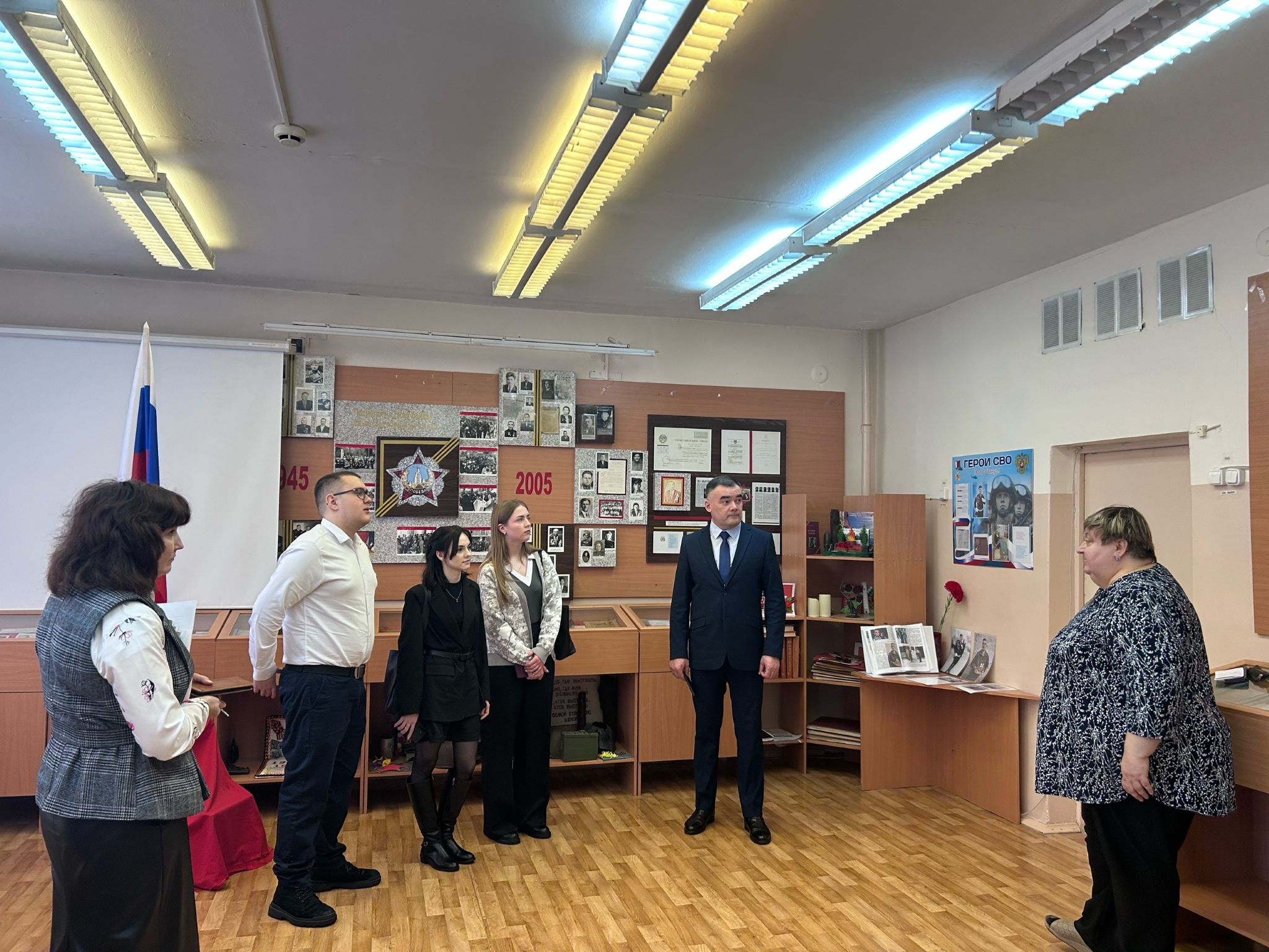 В завершении встречи заместитель директора школы по воспитательной работе Е.В. Паршикова провела для делегации нашего факультета экскурсию по школьному музею. Экспозиция музея включает уникальные материалы по истории не только учебного заведения, но и всего поселка. Здесь бережно хранятся выпускные альбомы всех выпусков школы, собираются сведения о выпускниках школы, достигших успехов в трудовой деятельности, в спорте и творчестве.