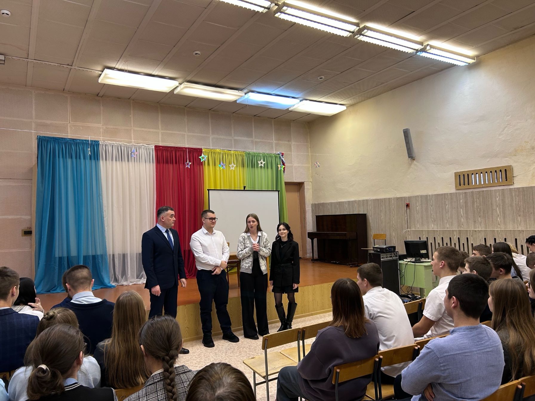 Следующая профориентационная беседа была проведена в ином формате. Вместе с Р.А. Соловьевым в среднюю общеобразовательную школу поселка Старь Дятьковского района отправились студенты первого курса Ростислав Баглай, Дарья Гайсенок и Ульяна Молчанова.
