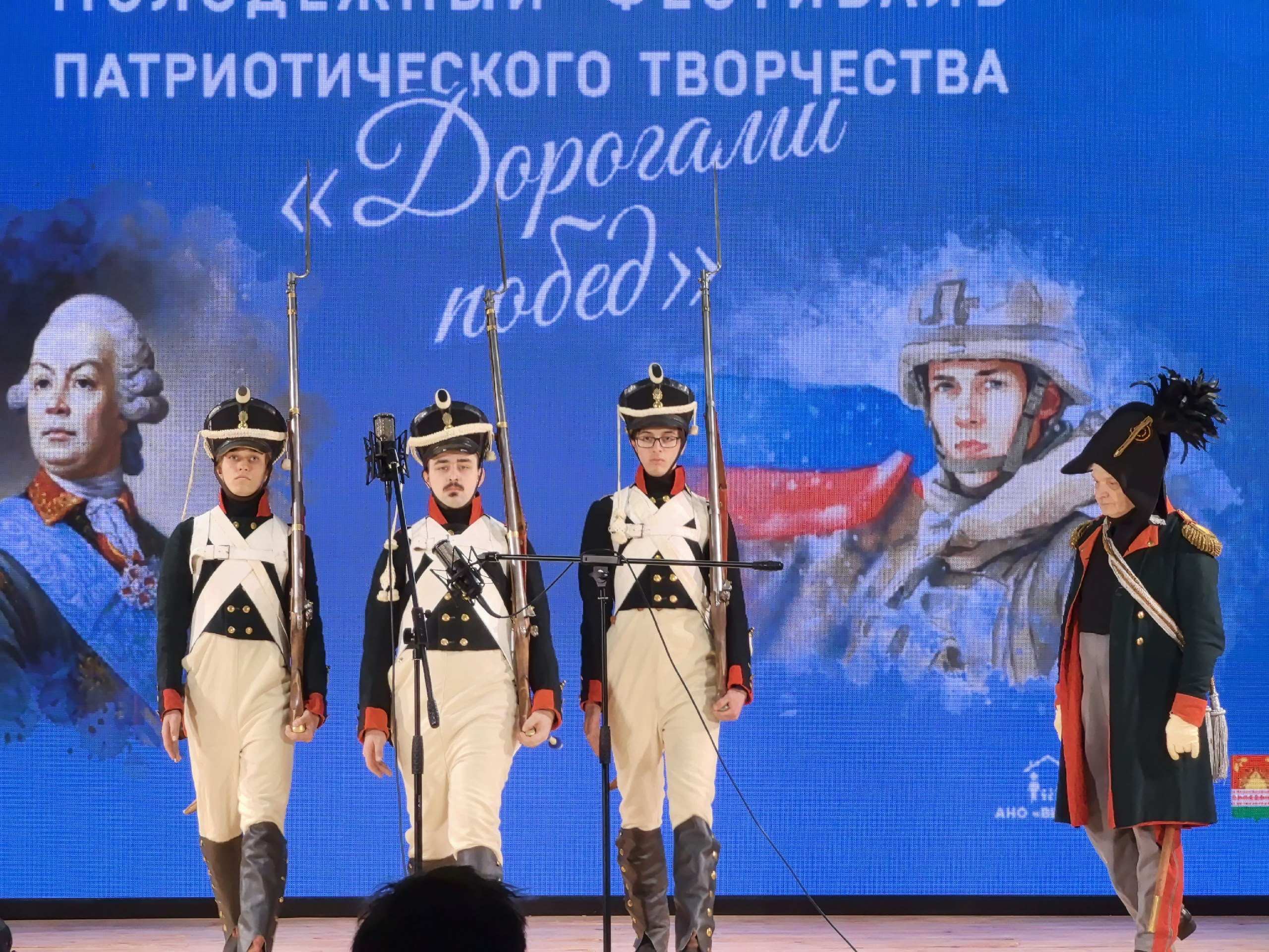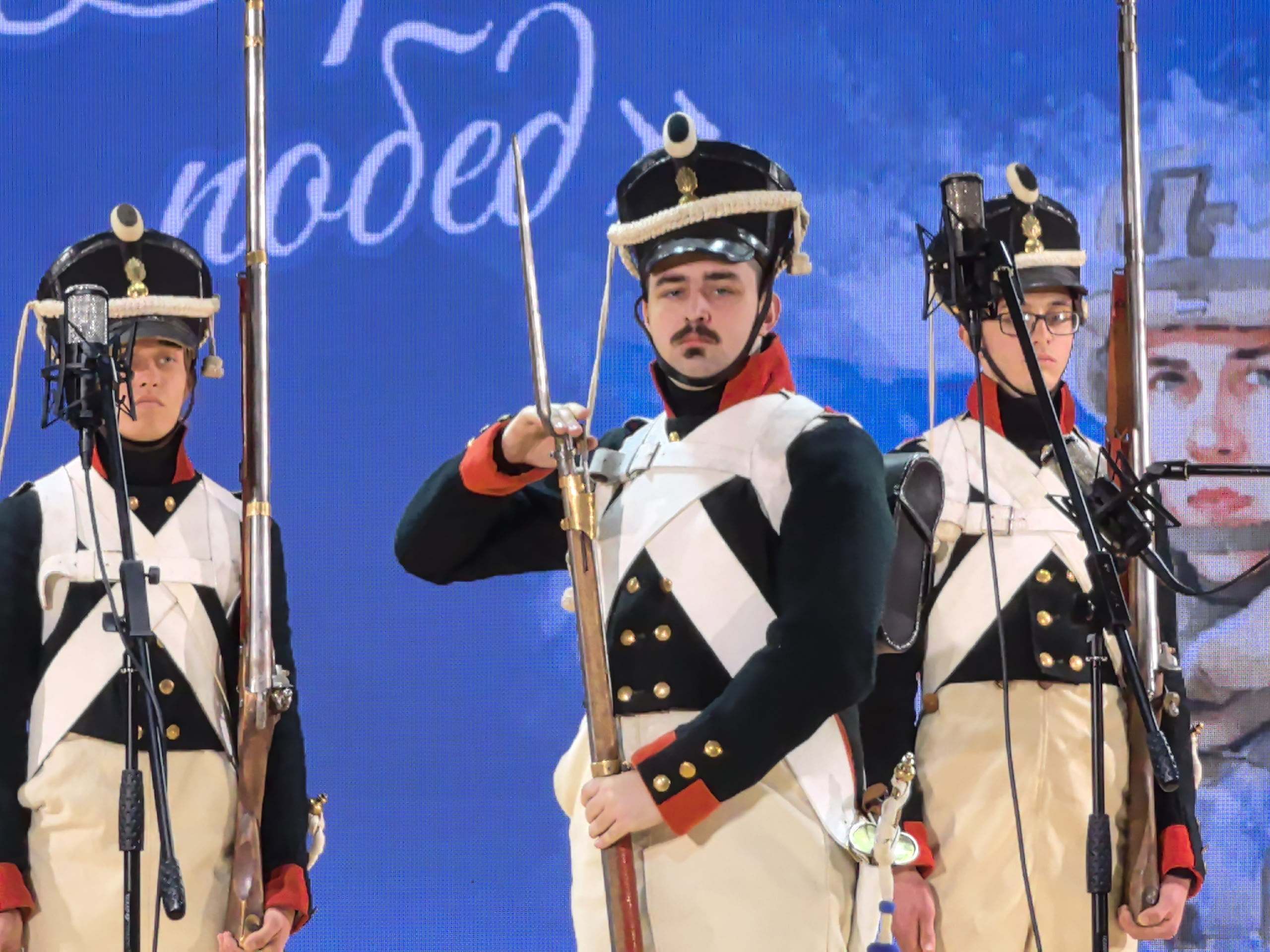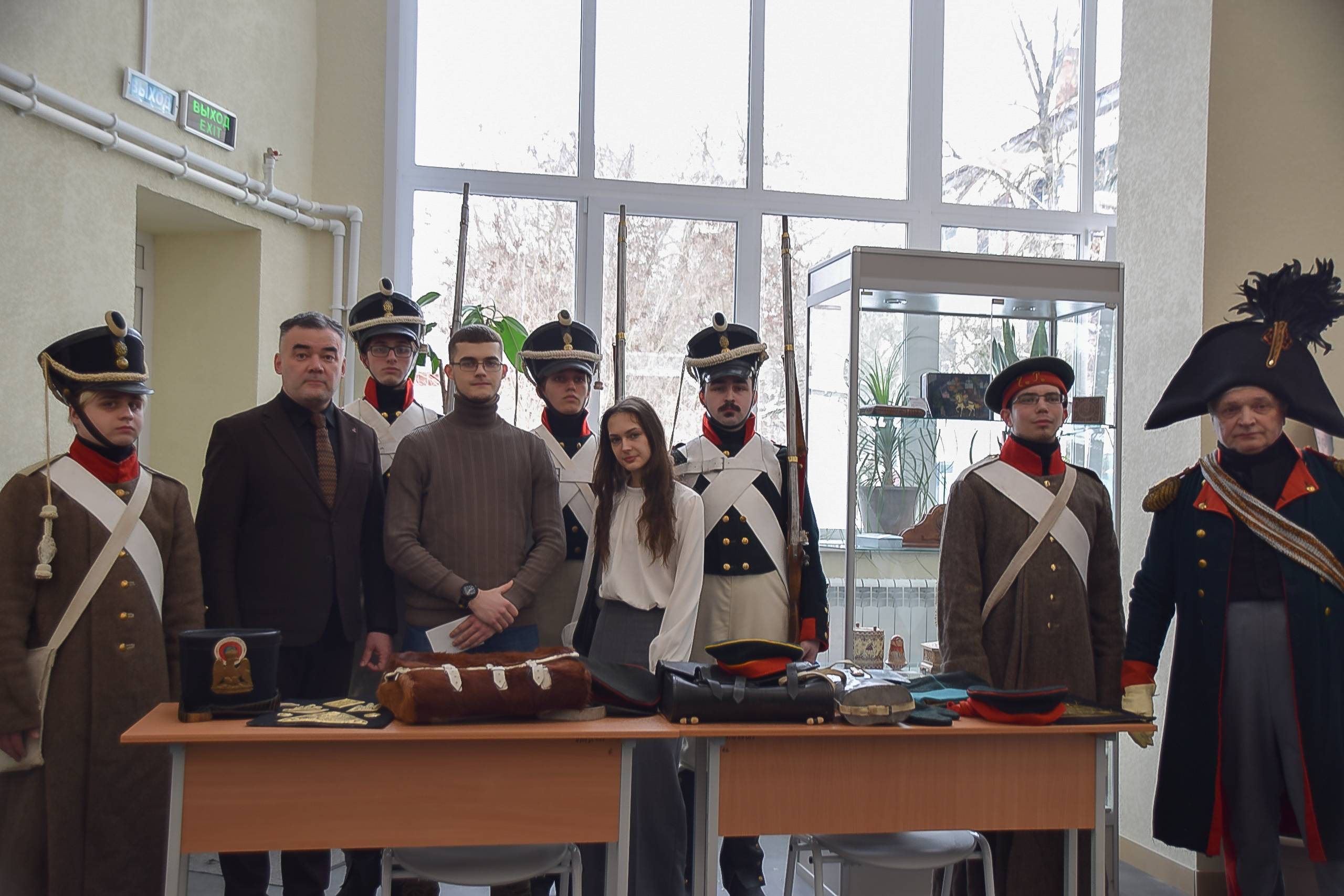 Студенты нашего факультета стали не только зрителями, но и активными участниками мероприятия. В частности, первокурсники бакалавриата Георгий Крюков, Максим Комков, Даниил Зуев и третьекурсники Никита Щевелев и Денис Шилов как участники военно-исторического клуба «Севский пехотинец» вместе со своим наставником А.А. Ромашевским представили экспозицию, посвященную экипировке военнослужащих русской армии в период Отечественной войны 1812 года, а затем уже на сцене показали строевые и ружейные приемы, принятые в русской армии во время Отечественной войны 1812 г.