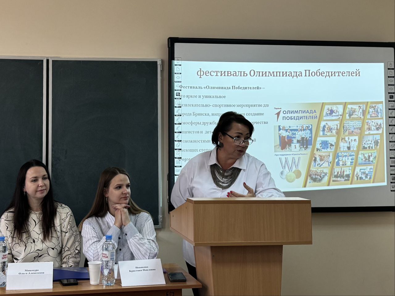 Захарова Ирина Владимировна (руководитель методического объединения учителей начальных классов Бежицкого района, эксперт по аттестации педагогов, Почетный работник образования, учитель начальных классов МБОУ «Брянский городской лицей № 2 им. М. В. Ломоносова») и Напреенко Мария Сергеевна (заместитель председателя лицейского родительского комитета, координатор проекта, волонтер) рассказали о проектной технологии и специфике ее реализации при организации урочной и внеурочной деятельности в начальной школе. В качестве примера они продемонстрировали результаты проекта "Олимпиада Победителей", организованного для ребят с ограниченными возможностями здоровья и их семей и проведенного на площадке лицея. Мероприятие было реализовано при поддержке Грантового конкурса Общероссийского общественно-государственного движения детей и молодежи «Движения Первых».