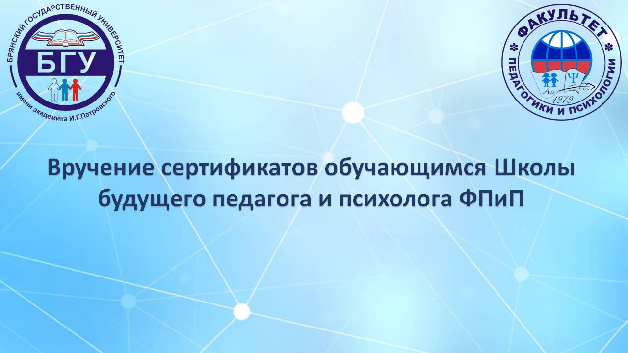 На факультете педагогики и психологии состоялось торжественное вручение сертификатов выпускникам «Школы будущего педагога». Более 16 учащихся 10-11 классов города Брянска (МБОУ СОШ №4, 14, 11, 39, 9, 26, ГБОУ Брянского городского лицея №1, МБОУ гимназия №5, МБОУ гимназия №1) завершили первый, начальный этап своего профессионального становления и познакомились с разнообразием педагогических профессий.