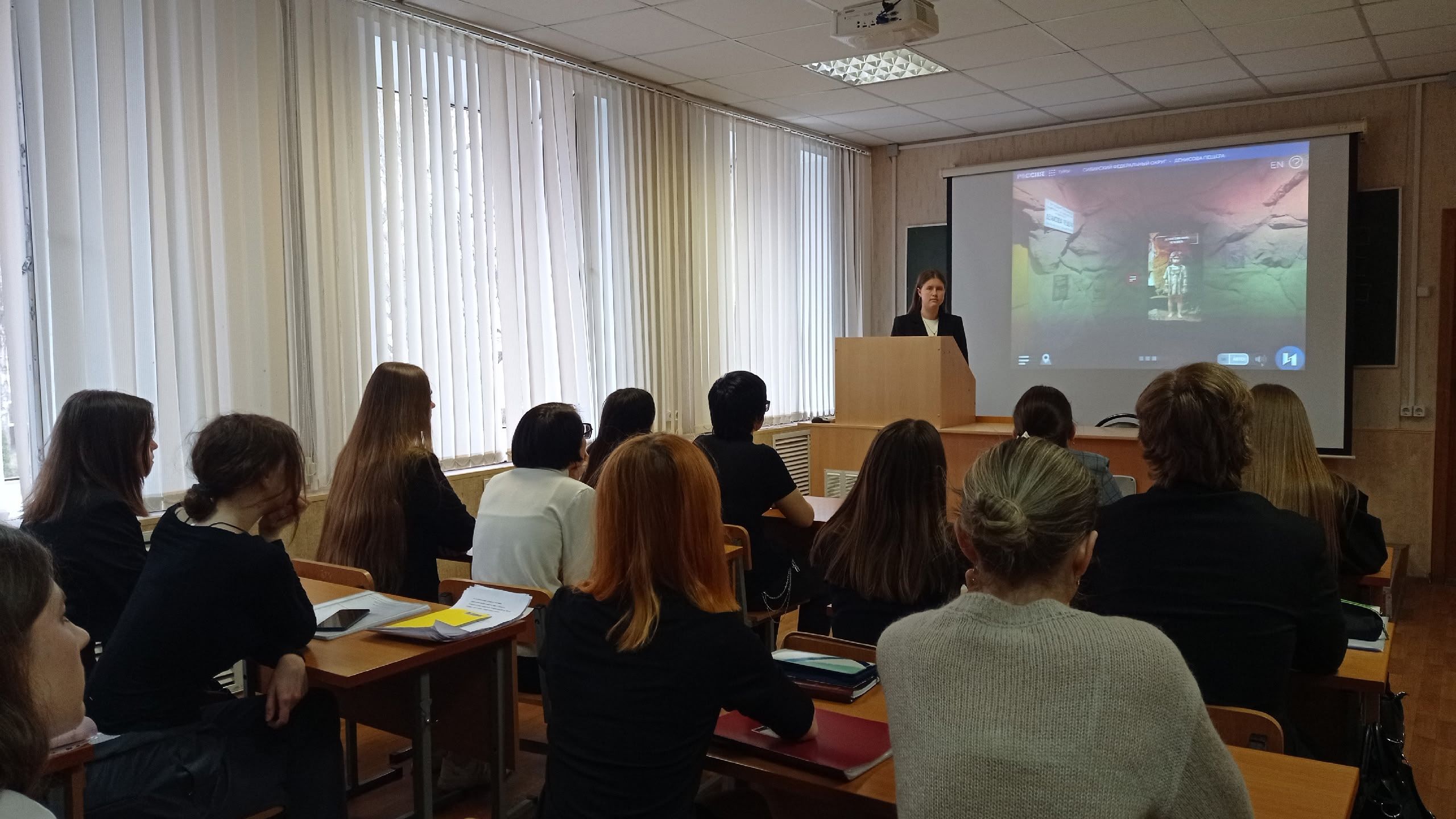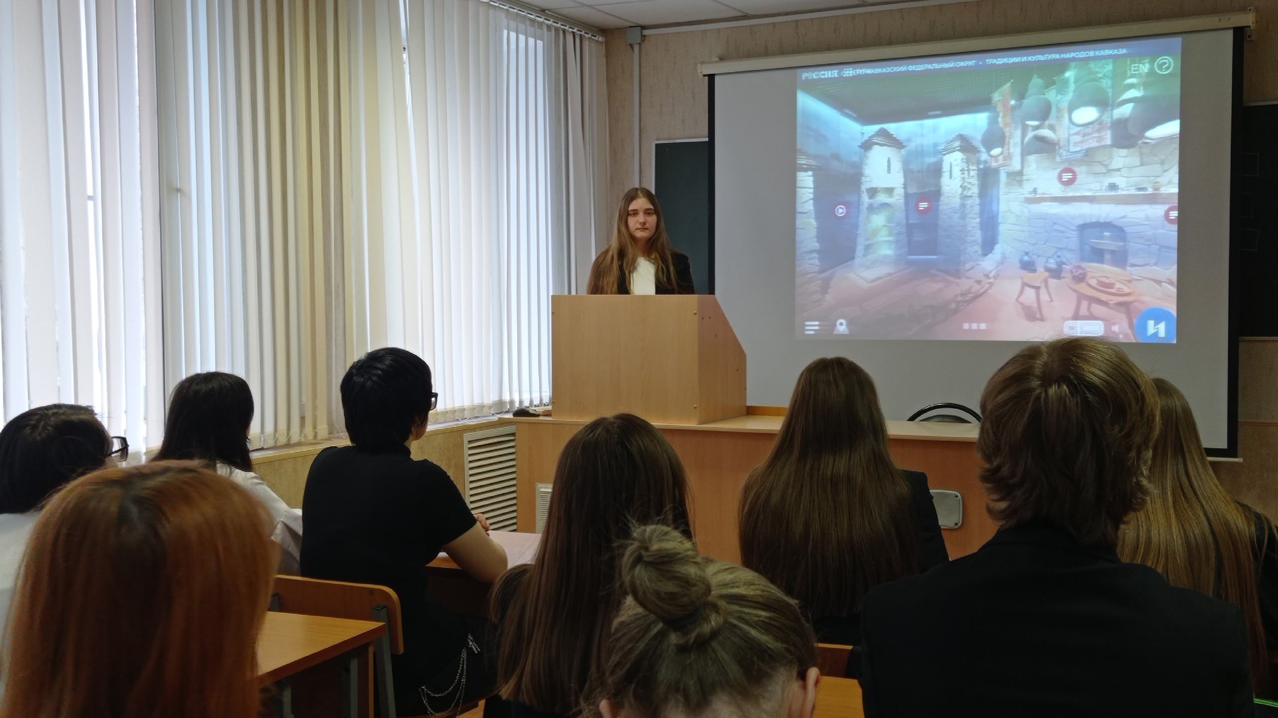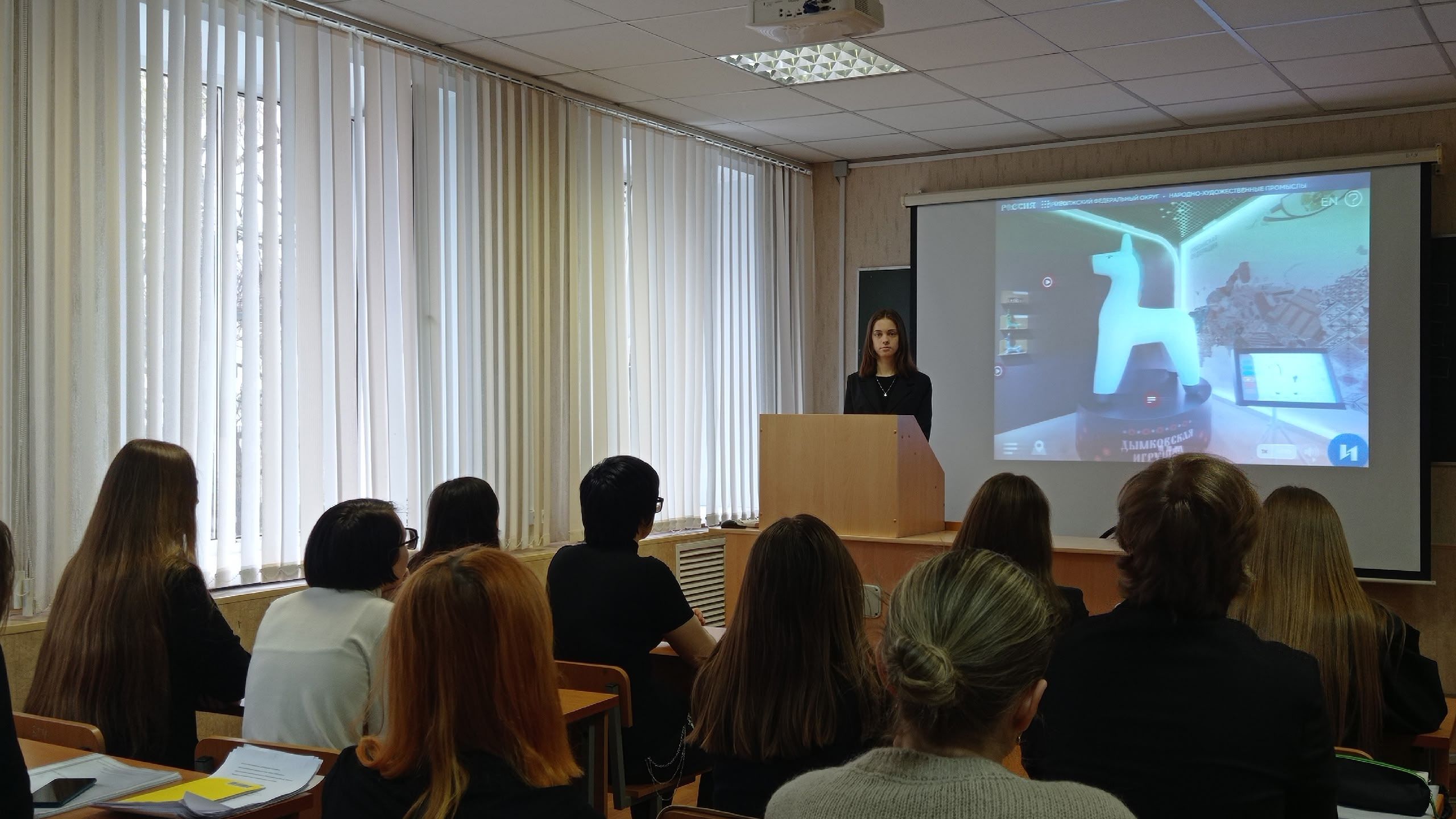 В роли гидов выступили активисты студенческого совета факультета. Они заранее изучили материалы онлайн-выставки и подготовили увлекательные рассказы о разных уголках России. Студенты-зрители, не выходя из аудитории, «прогулялись» по виртуальным залам Национального центра, останавливаясь у стендов, посвящённых конкретным регионам.