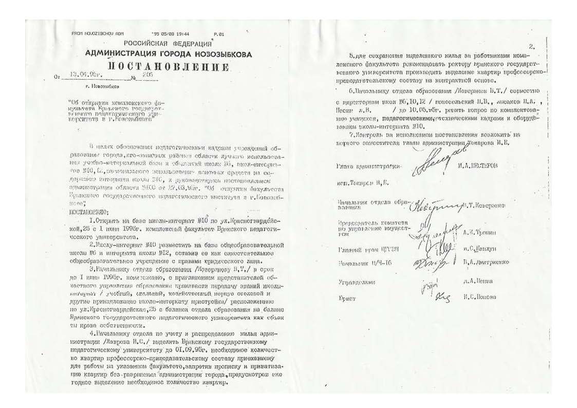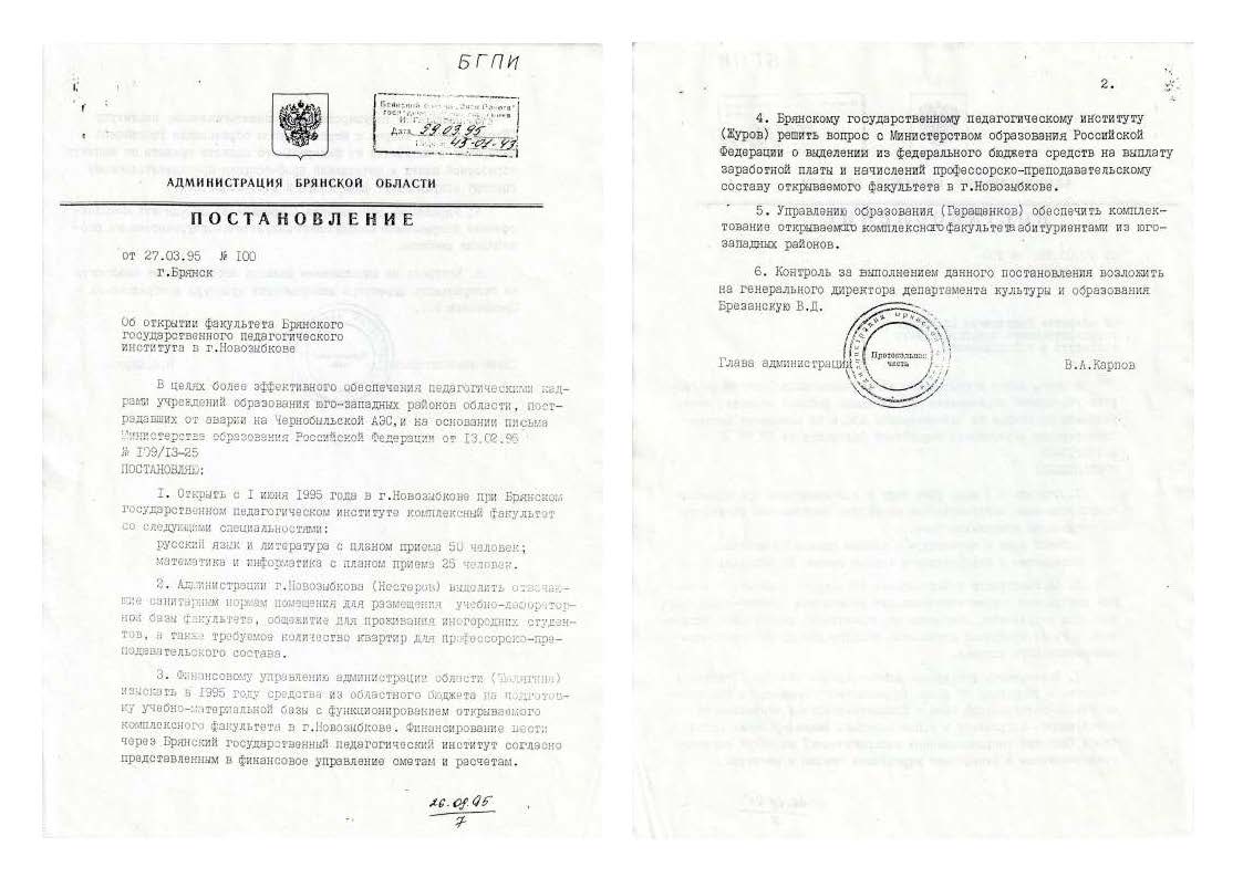 1995 г. – открытие комплексного факультета БГПУ им. Петровского в г. Новозыбкове, преобразованного в 1998 году в полноценный филиал.