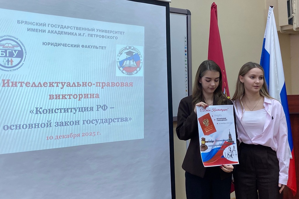 Для формирования гражданской позиции и выработки профессиональных умений и навыков будущих юристов большое значение имеет применение нестандартных способов изучения обучающимися нормативных актов и прежде всего – Основного закона страны. 12декабря 2025 года на юридическом факультете состоялась интеллектуально-правовая викторина «Конституции РФ – основной закон государства». Квиз приурочен к важнейшему событию для всех граждан России – 32-летию со дня принятия Конституции РФ.