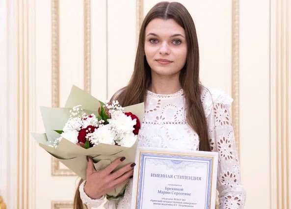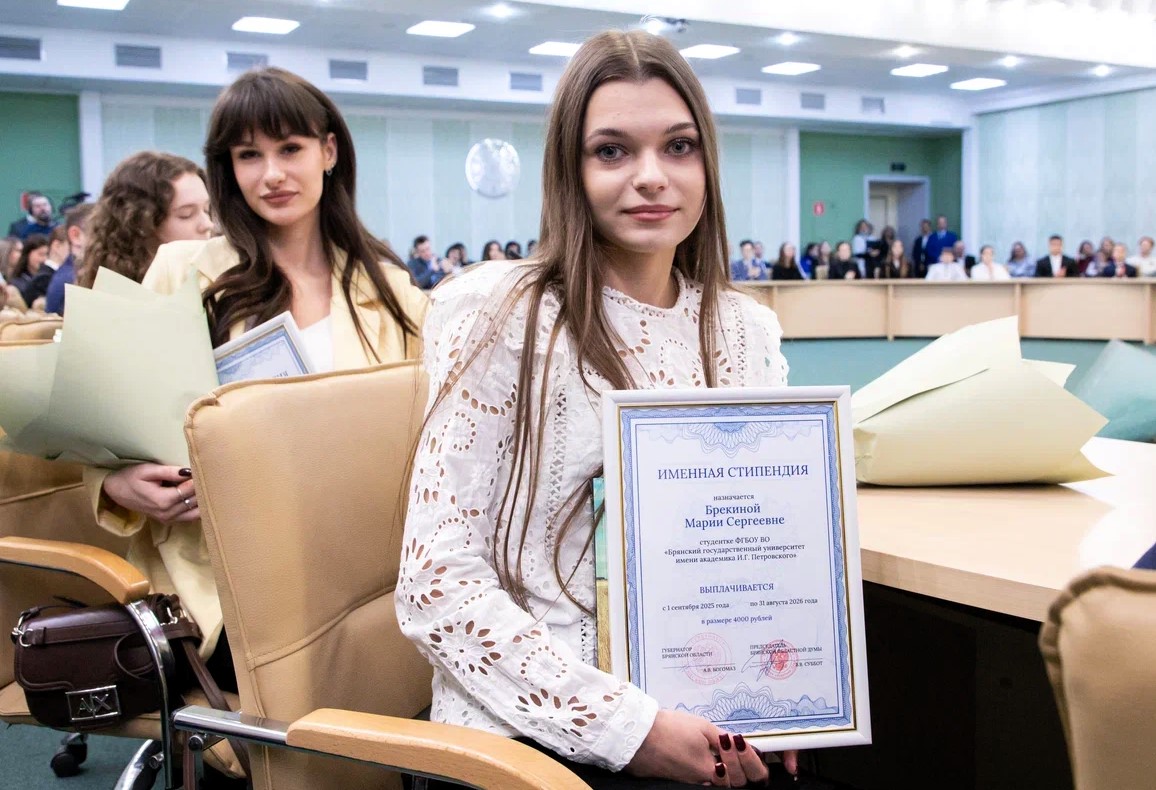 Свидетельство о назначении именной стипендии Правительства Брянской области и Брянской областной Думы М. Брекиной вручил лично Губернатор А.В. Богомаз. Эта высокая награда — результат рассмотрения Ученого совета университета и решения специальной Комиссии, которая по достоинству оценила академические успехи, научную и общественную активность нашей студентки.