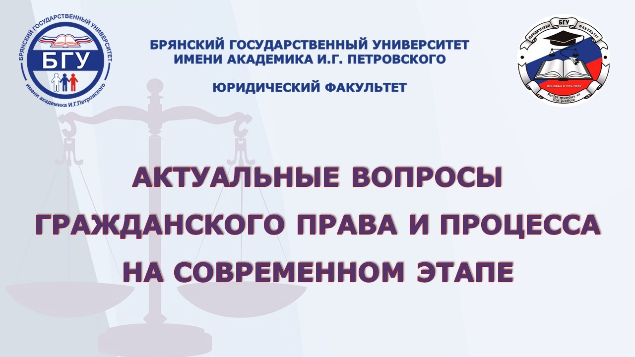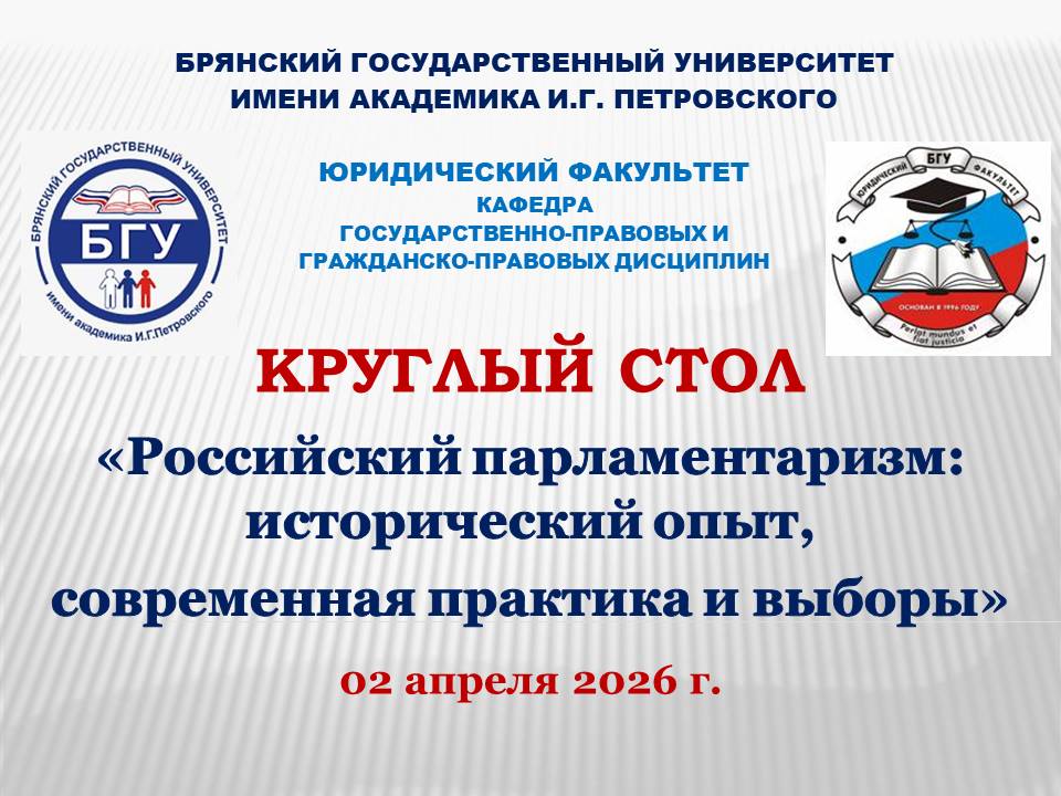 17 апреля 2026 года на юридическом факультете Брянского государственного университета имени академика И.Г. Петровского состоялся круглый стол на тему «Актуальные вопросы гражданского и семейного права на современном этапе». Мероприятие было приурочено к юбилеям вступления в силу части второй Гражданского кодекса Российской Федерации и Семейного кодекса Российской Федерации. Организатором выступила кафедра государственно-правовых и гражданско-правовых дисциплин. Заседание прошло в смешанном формате с очным участием спикеров и дистанционным подключением гостей из других регионов.