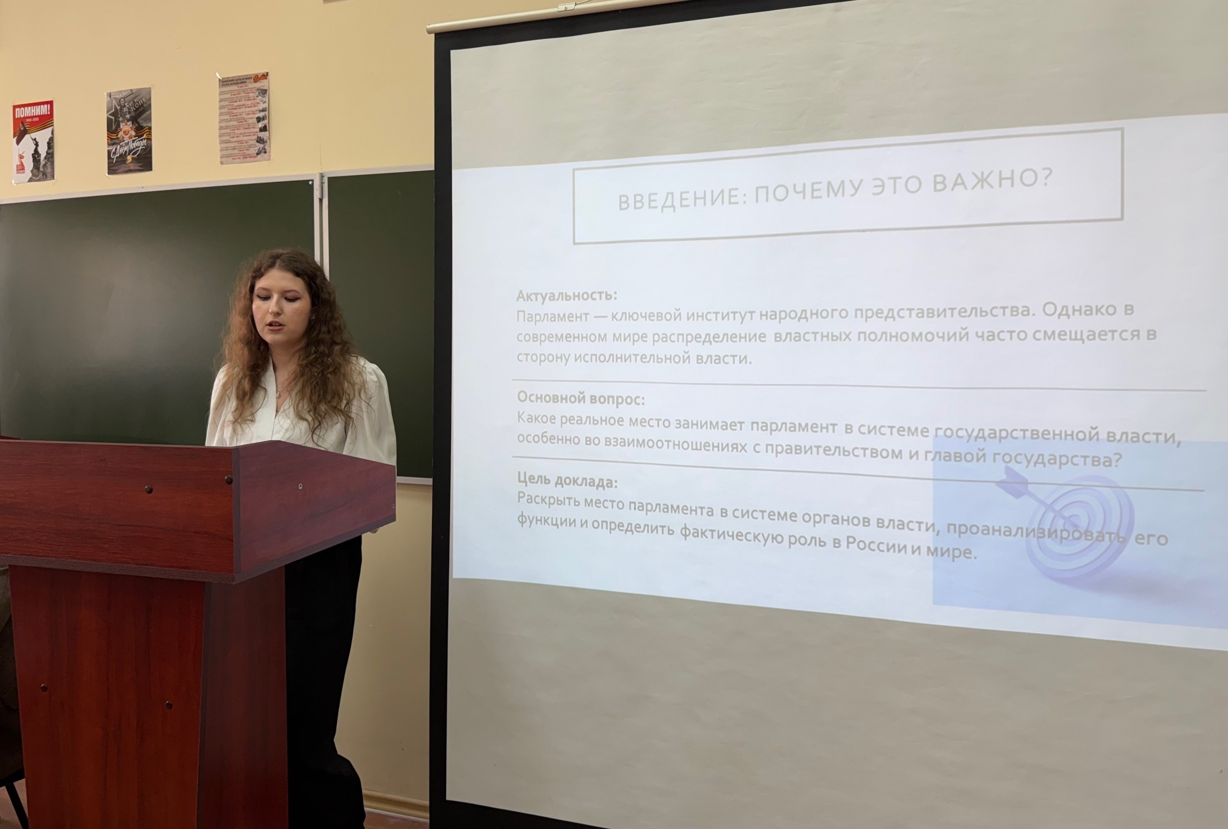 В рамках круглого стола был выделен отдельный блок, посвященный предстоящим в сентябре 2026 года выборам в Государственную Думу IX созыва. Кочетова Владислава и Лисовская Николь представили доклад об истории выборов в Первую Государственную Думу Российской империи. Пронина Елизавета и Филимонова Арина на основе анализа избирательного законодательства и практики показали качественные характеристики выборов в Государственную Думу на современном этапе. Молодые ученые обратили внимание на то, что привлечение участников СВО во все механизмы избирательной системы – как в составе комиссий, так и в качестве кандидатов, помогли усилить всё, что ранее создавалось для совершенствования российской избирательной системы. Ярко и наглядно ознакомила собравшихся с предвыборными программами политических партий Короткая Алёна.