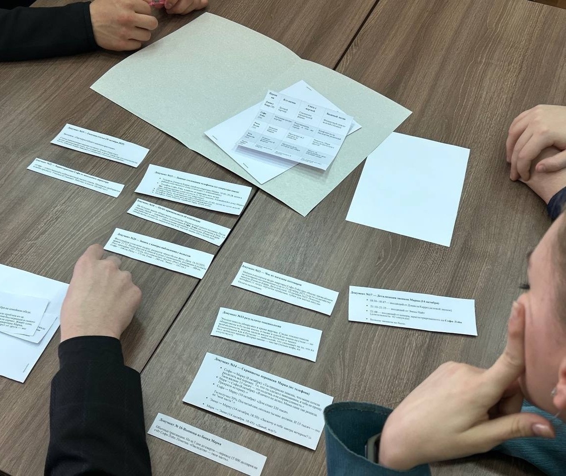 • Работу с доказательствами — участники изучали улики, восстанавливали хронологию событий и выстраивали логику мотива преступника.